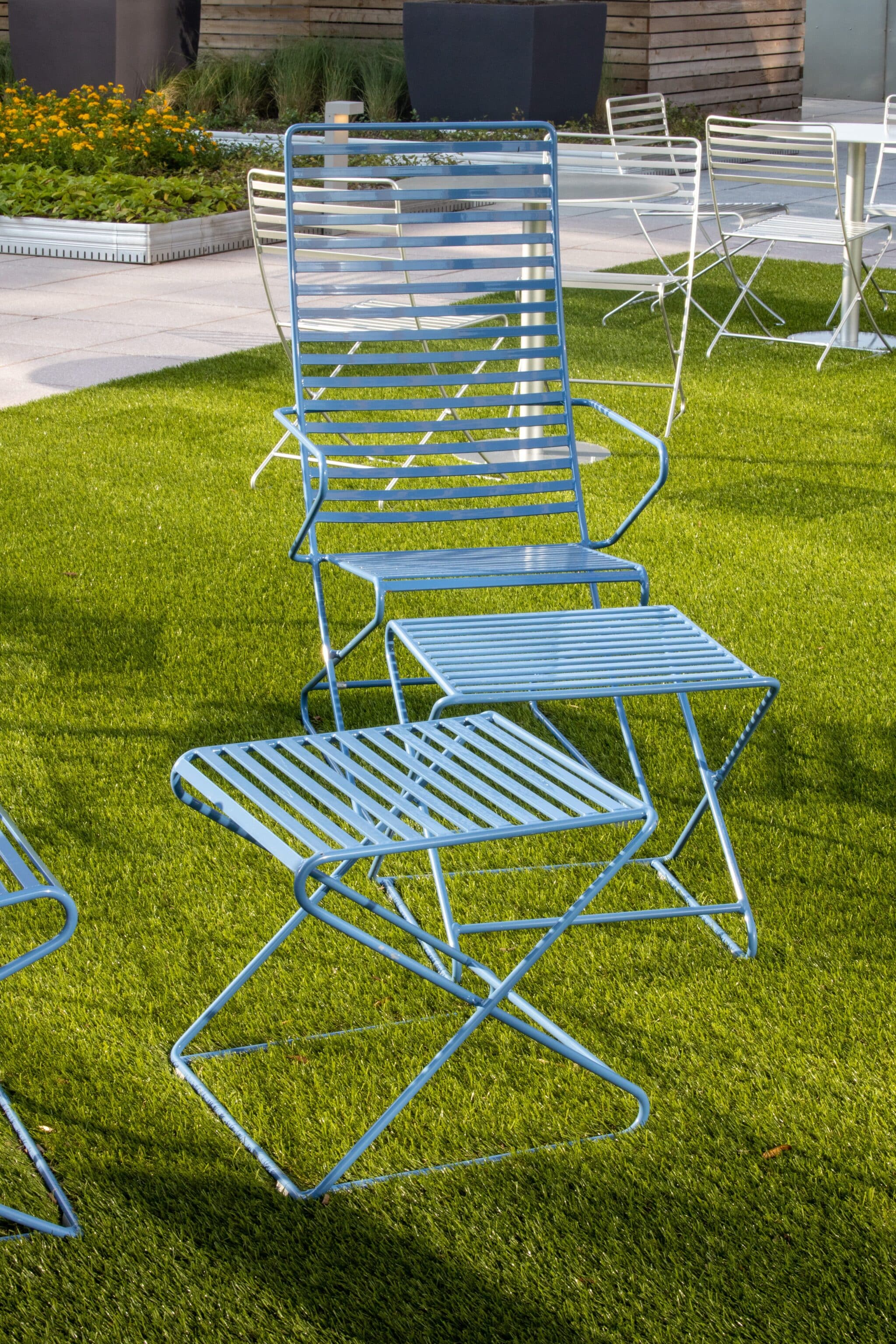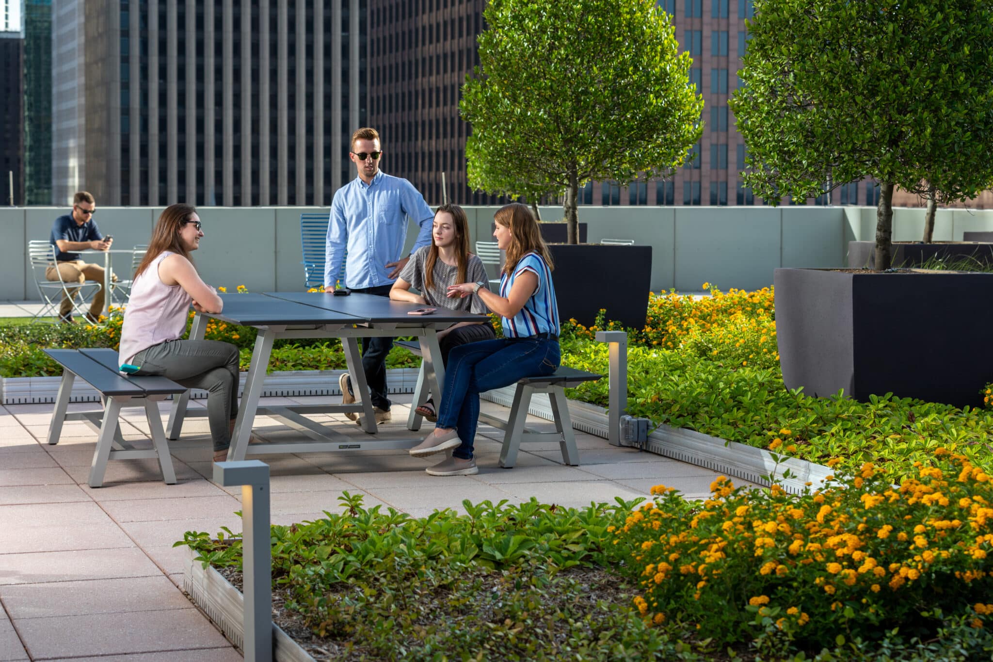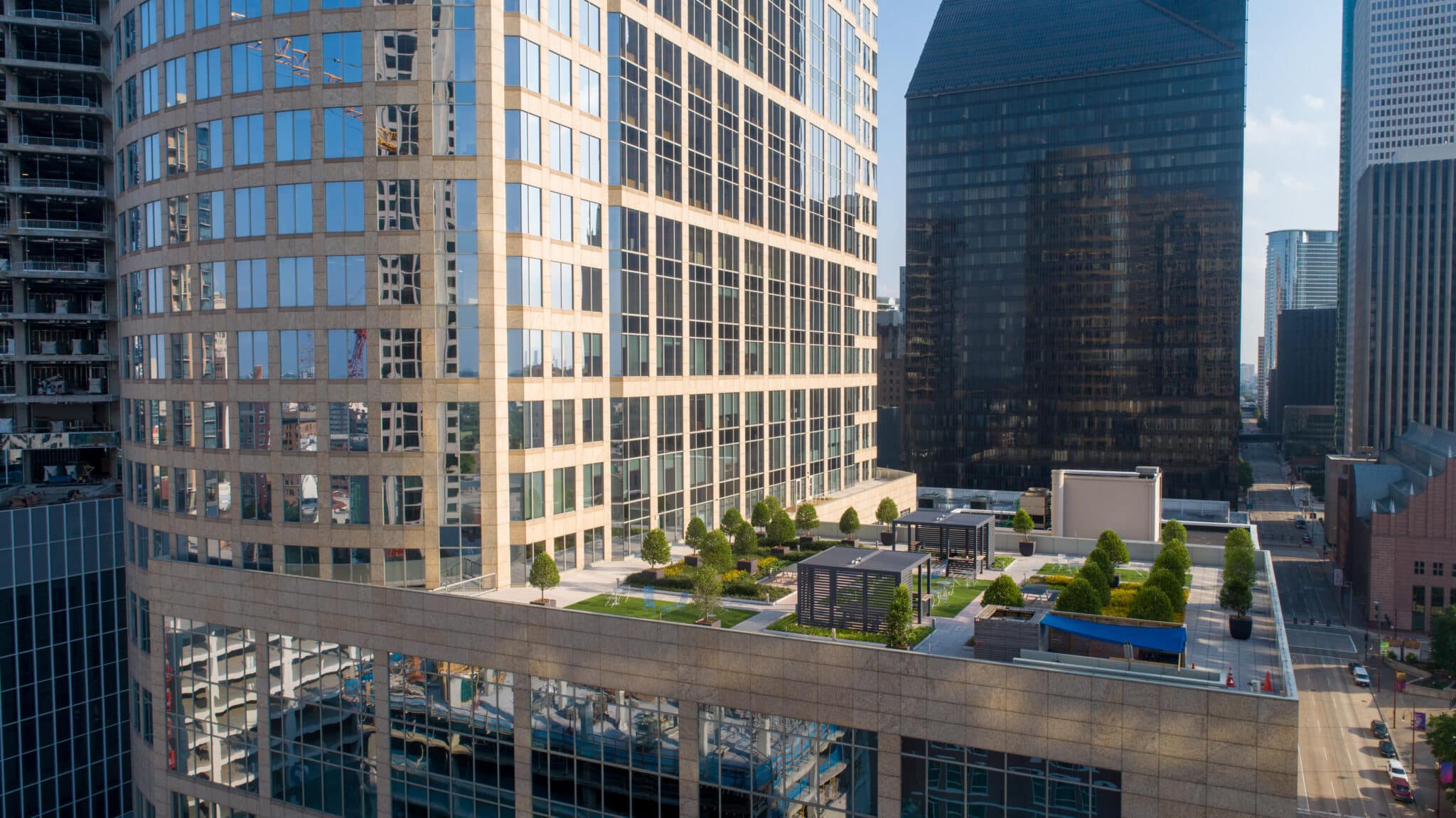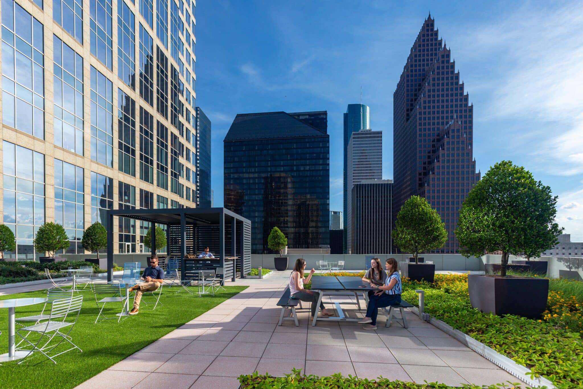 Clark Condon worked with Hines to renovate a private 14,000 square foot terrace on the twelfth floor of 717 Texas in downtown Houston. The formal design has lighted circulation paths leading to a central gathering space. The event space is anchored by two shade structures with artificial turf and flexible seating. Native and adaptive plants, relocated trees, and planters are arranged to create a formal grid throughout. Ample space and downtown views create an engaging outdoor terrace for respite and private events.