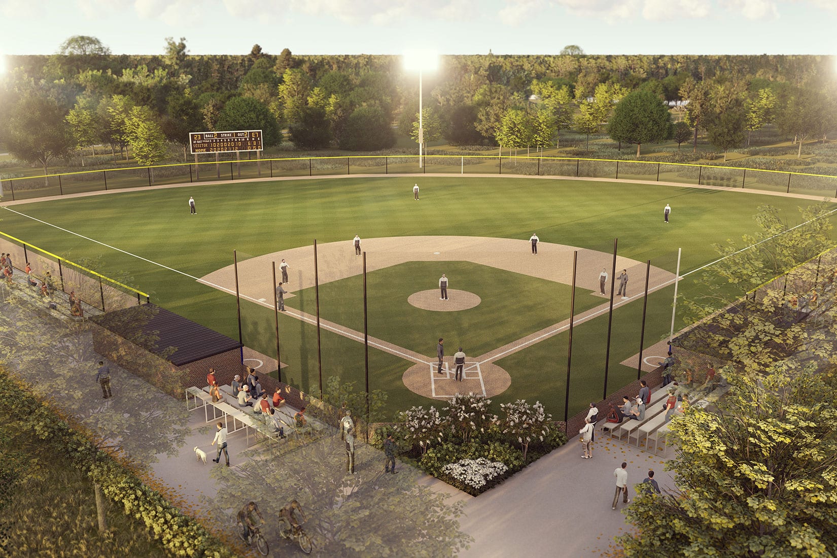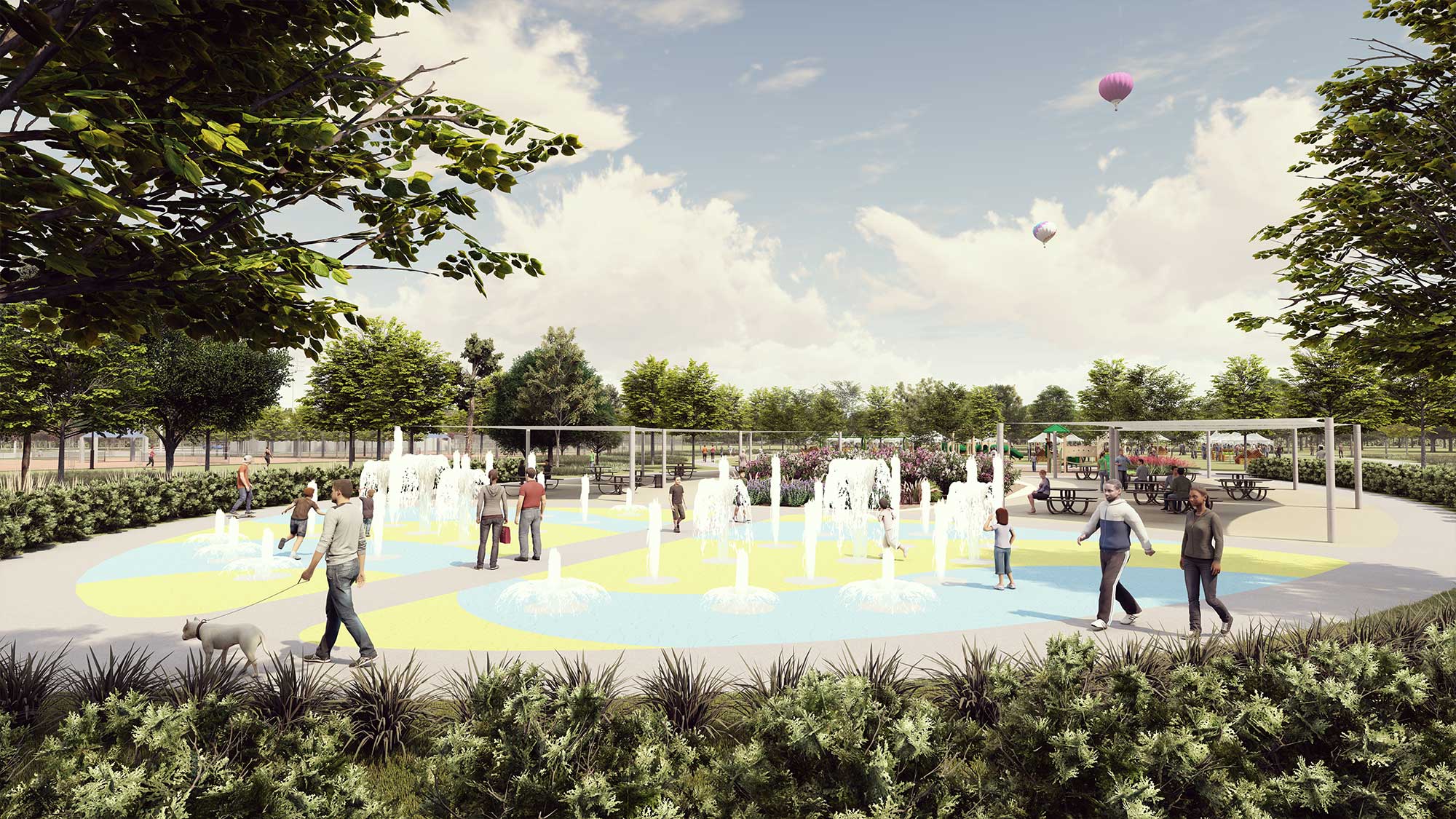 HIGHLIGHTS: | Event space, splash pad and community pool, playgrounds, gardens, dog park, ball fields, disc golf, multi-use trail, basketball court, tennis complex, community building, and parking. |