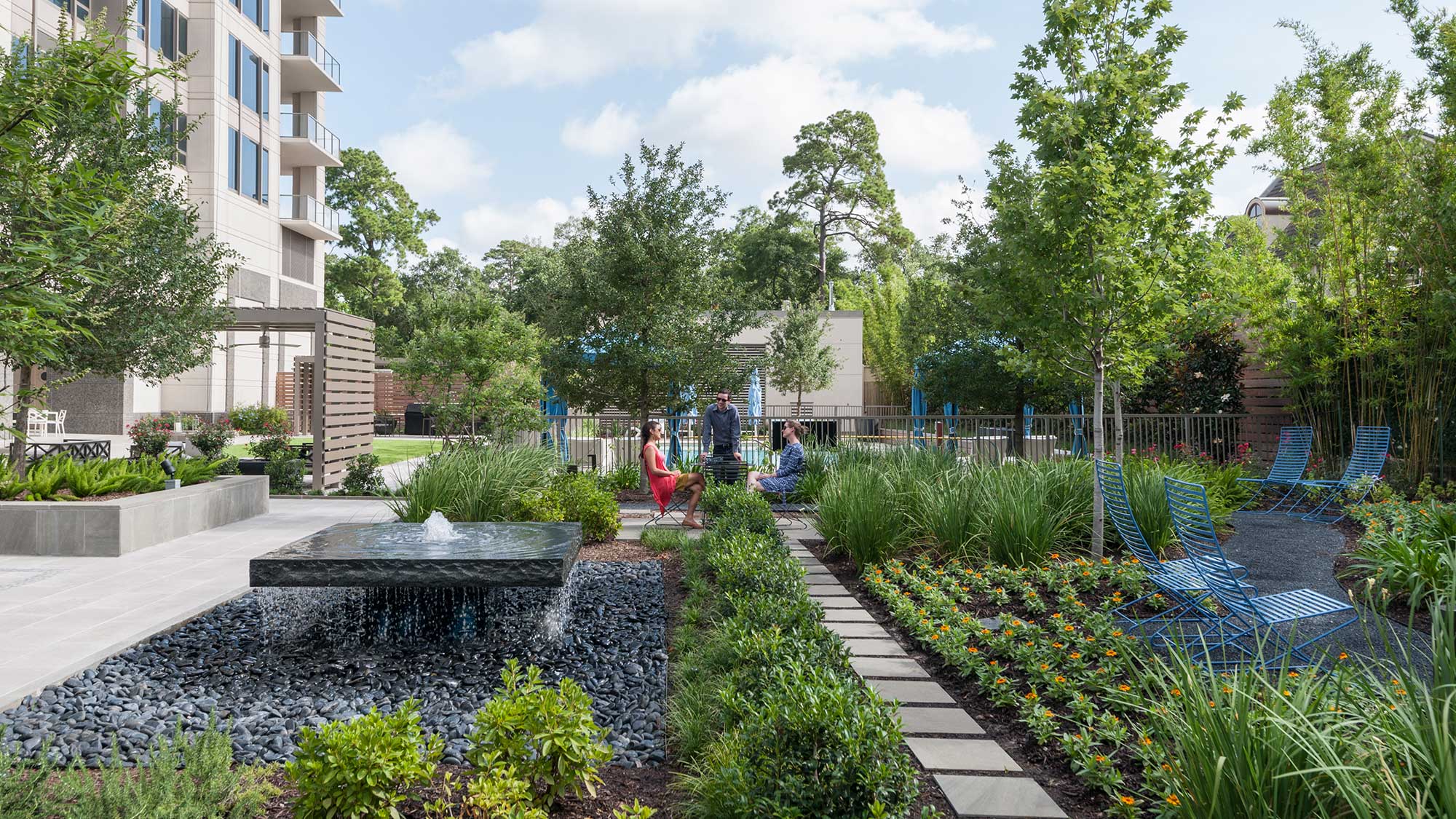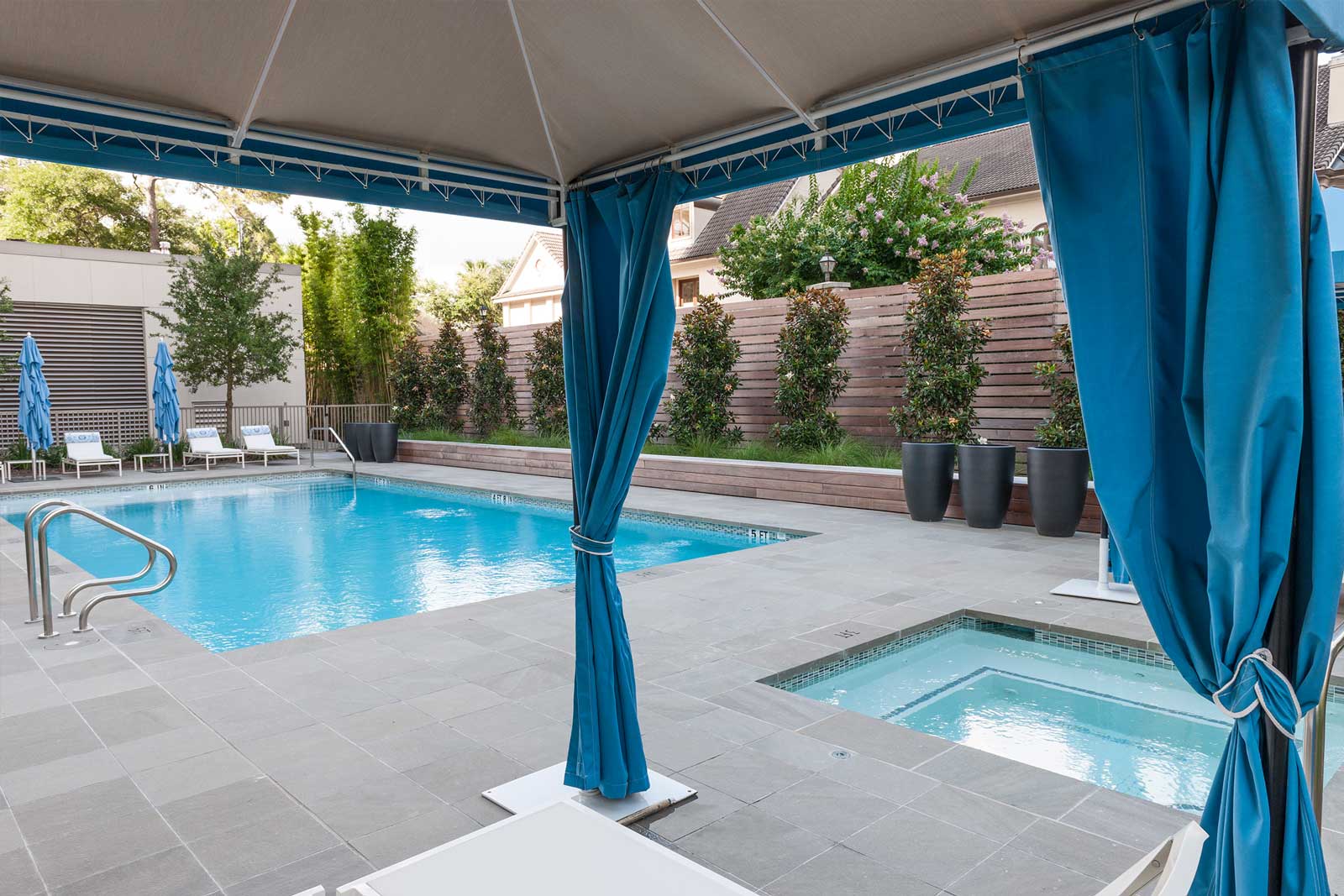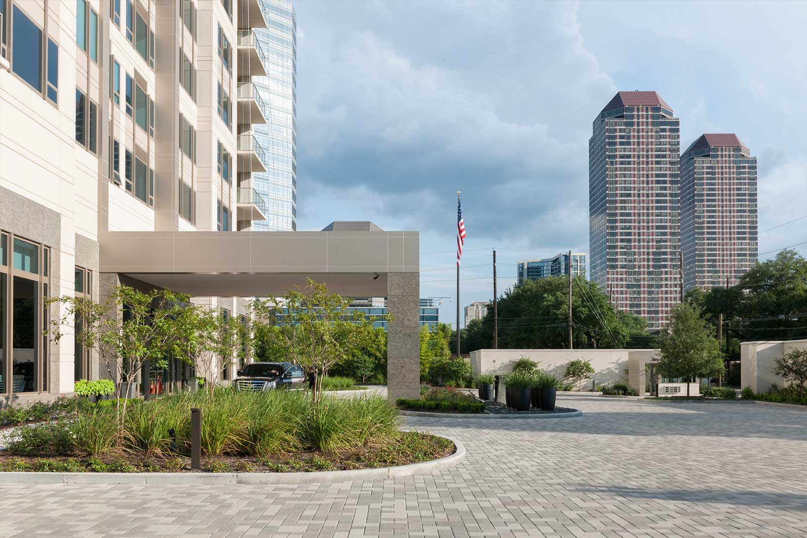 This 26-story, luxury high-rise condominium is surrounded by a rare and private urban setting and will be an integral part of Houston’s vibrant Uptown area. Every detail of this extraordinary living experience has been considered and planned. In addition to the expansive corner terraces that each resident will have, we have created a one-of-a-kind outdoor community amenity, including a garden, pool, multi-use open lawn, variety of seating, a water feature and covered lounge area. The amenity area is built on top of an underground parking structure. The materials selected build on the richness and sophistication of the building design to create a private oasis in Uptown Houston.