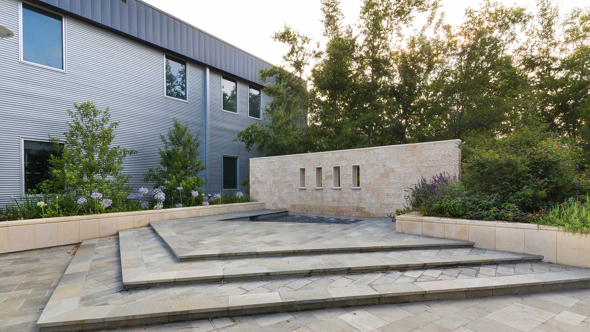 After preparing a master plan, our scope of design services included enhancing the front entrance, pathways, creating a multi-purpose courtyard and adding a play area for older children. The courtyard design echoes the contemporary angular design of the building. The materials are continued from the interior of the fellowship hall to the exterior creating a cohesive gathering place that extends outdoors for events. The water feature is surrounded by steps that allow it to be used as a stage. The fountain contains movable grates to also serve as a baptismal. The four windows in the water feature represent the church’s values including life change, relationships, grace and missions. The new play area has a three-story tower that allows children to be among all of the tall foliage. There are many boulders placed along the sides encouraging kids to interact and climb within the landscape. Some of the interesting details of the project include the materials, the use of native and adaptive species, reforestation, night lighting, pathways that serve both as amenities and secure exits, parking lots and many considerations for future expansions.