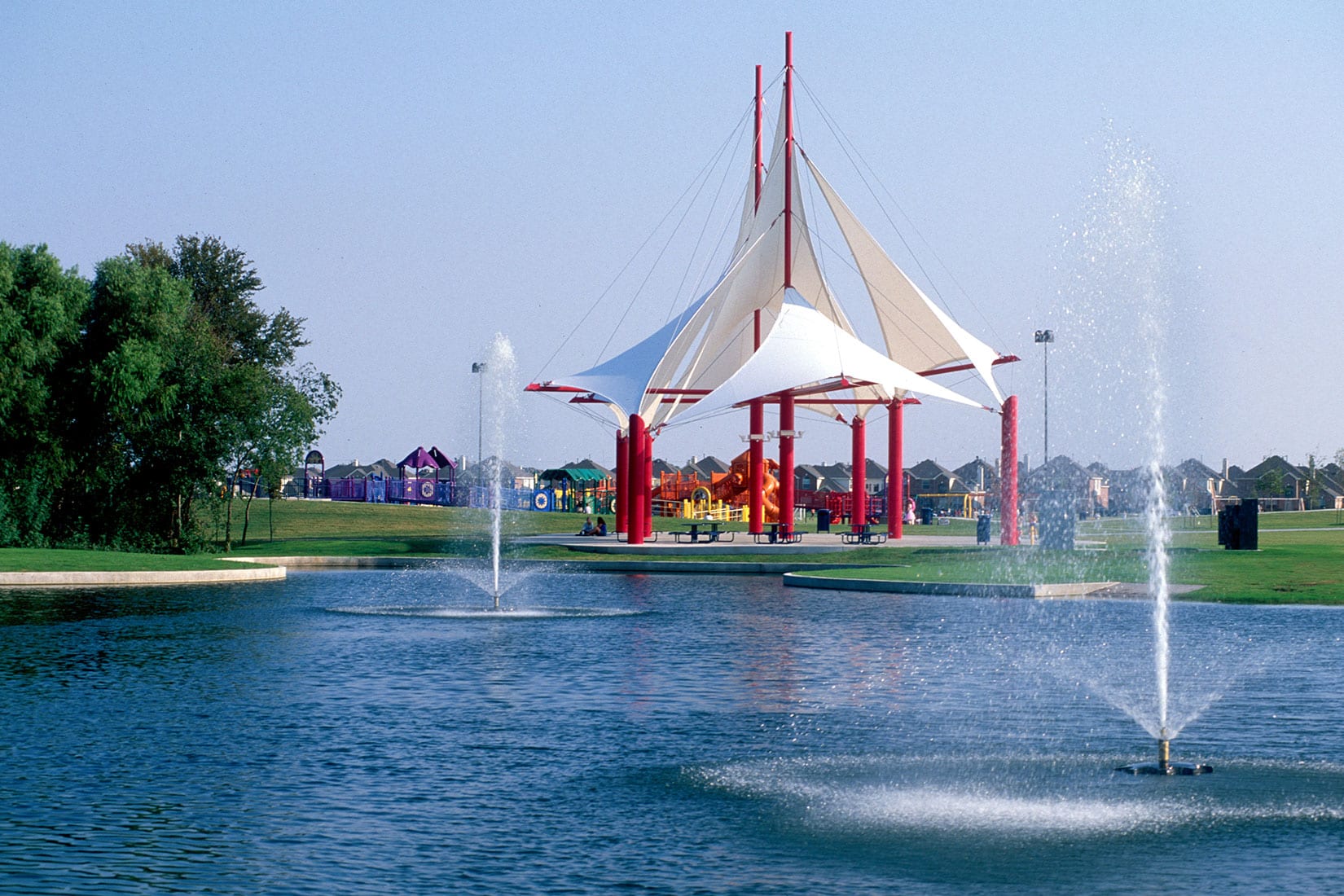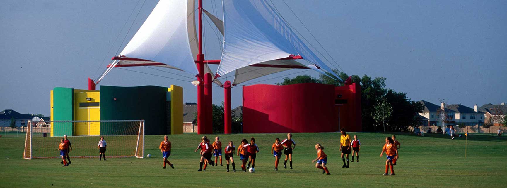 Starting with a largely open 100-acre site, Clark Condon collaborated with the City of Allen to design a landmark park. The idea and inspiration came from one program objective: to create a festival site. That evolved into the design of fanciful, iconic sail structures made of steel and soaring tensile fabric and brightly painted walls.