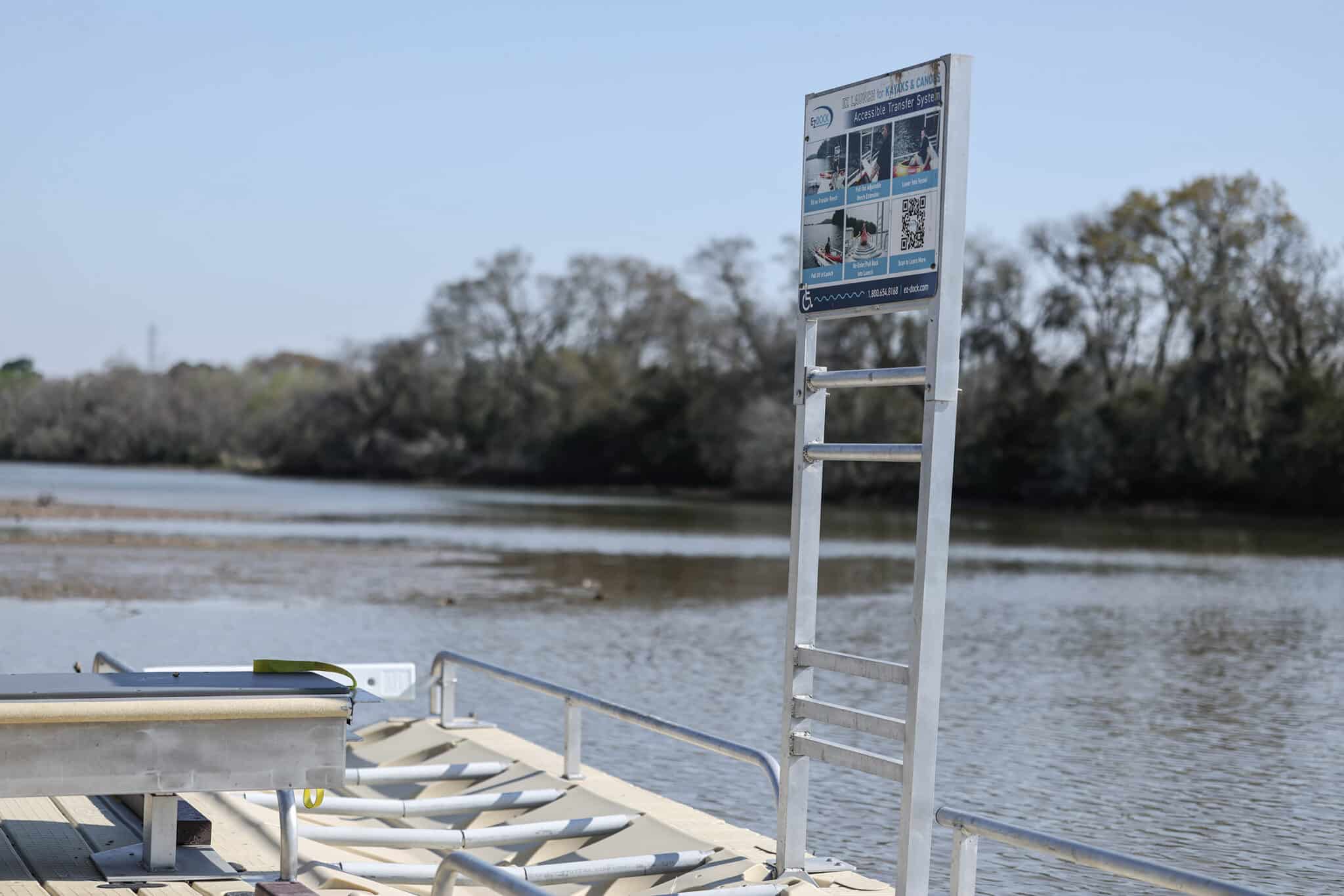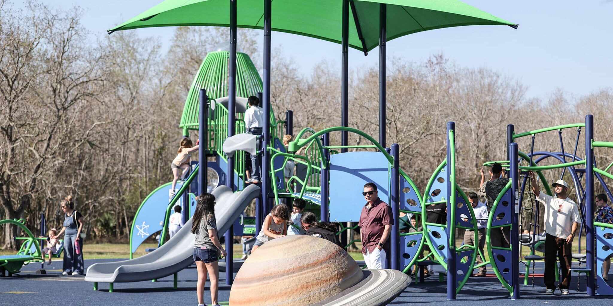 The renovations include the removal and replacement of the existing wooden boardwalk, as well as a new outdoor classroom and overlook with scenic views of the nearby wetlands. These structures are nestled within the existing tree canopy, providing captivating vistas of the wetlands. The predominantly 8-foot-high boardwalk offers a unique walking experience amidst the tree canopy, transitioning to ground level in one area to allow visitors to engage with the wetland vegetation. Carefully designed to minimize impact on the surrounding forest during construction, the boardwalk ensures environmental preservation. Additionally, a floating kayak launch, repurposed from the former boat ramp, and an 8-foot-wide trail are notable features, with the trail being the final segment needed to create a continuous walking loop around the park. Furthermore, the all-inclusive playground boasts poured-in-place surfacing for enhanced accessibility, complemented by custom space-themed graphics and play structures catering to various ages and abilities.