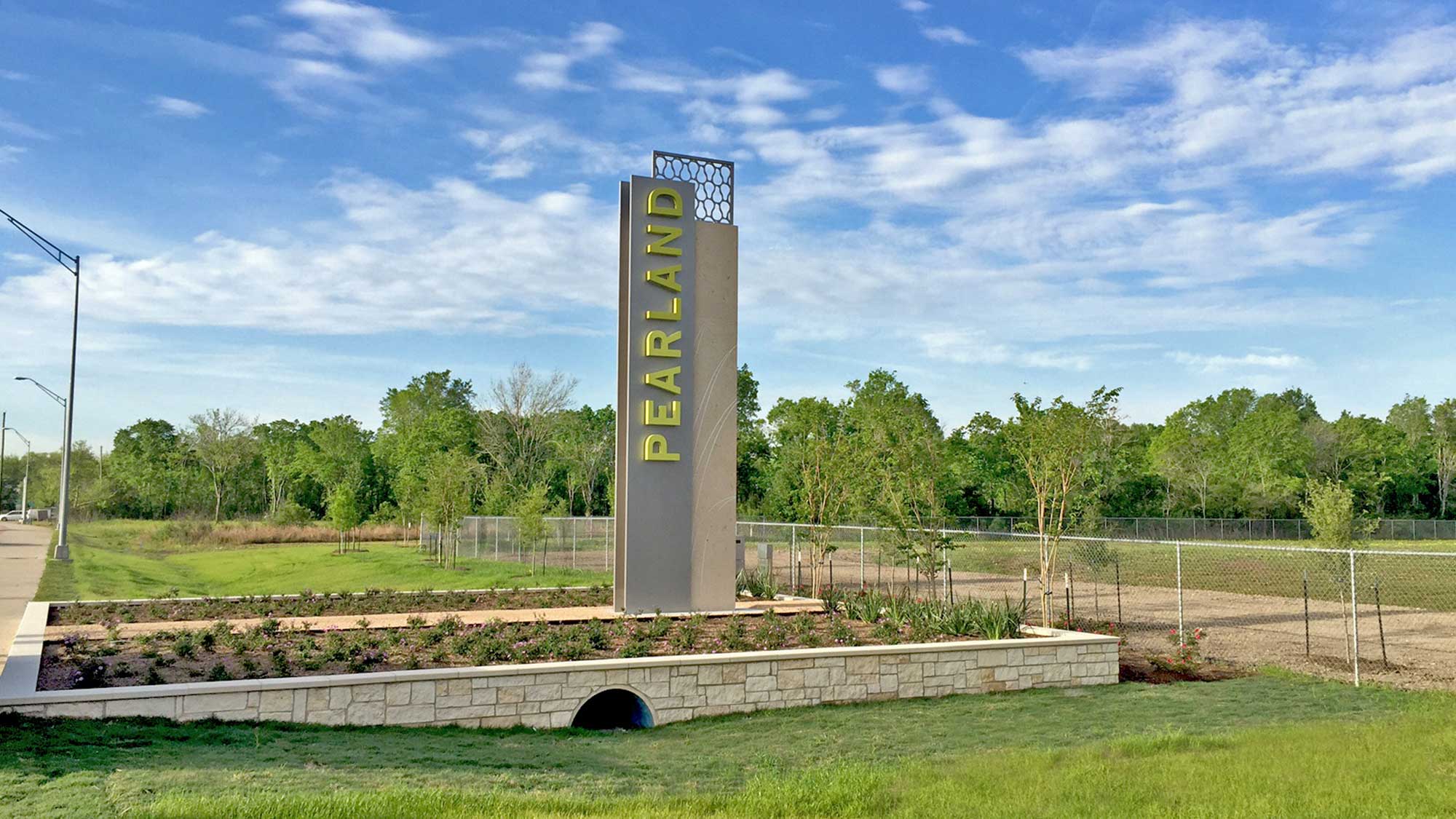 Additionally, we designed landscape improvements for SH 35 from Beltway 8 to Walnut Street to enhance the overall character of this major thoroughfare. The Pearland monuments have been installed at several key entry points to the city and provide a welcoming aesthetic along the roadway.