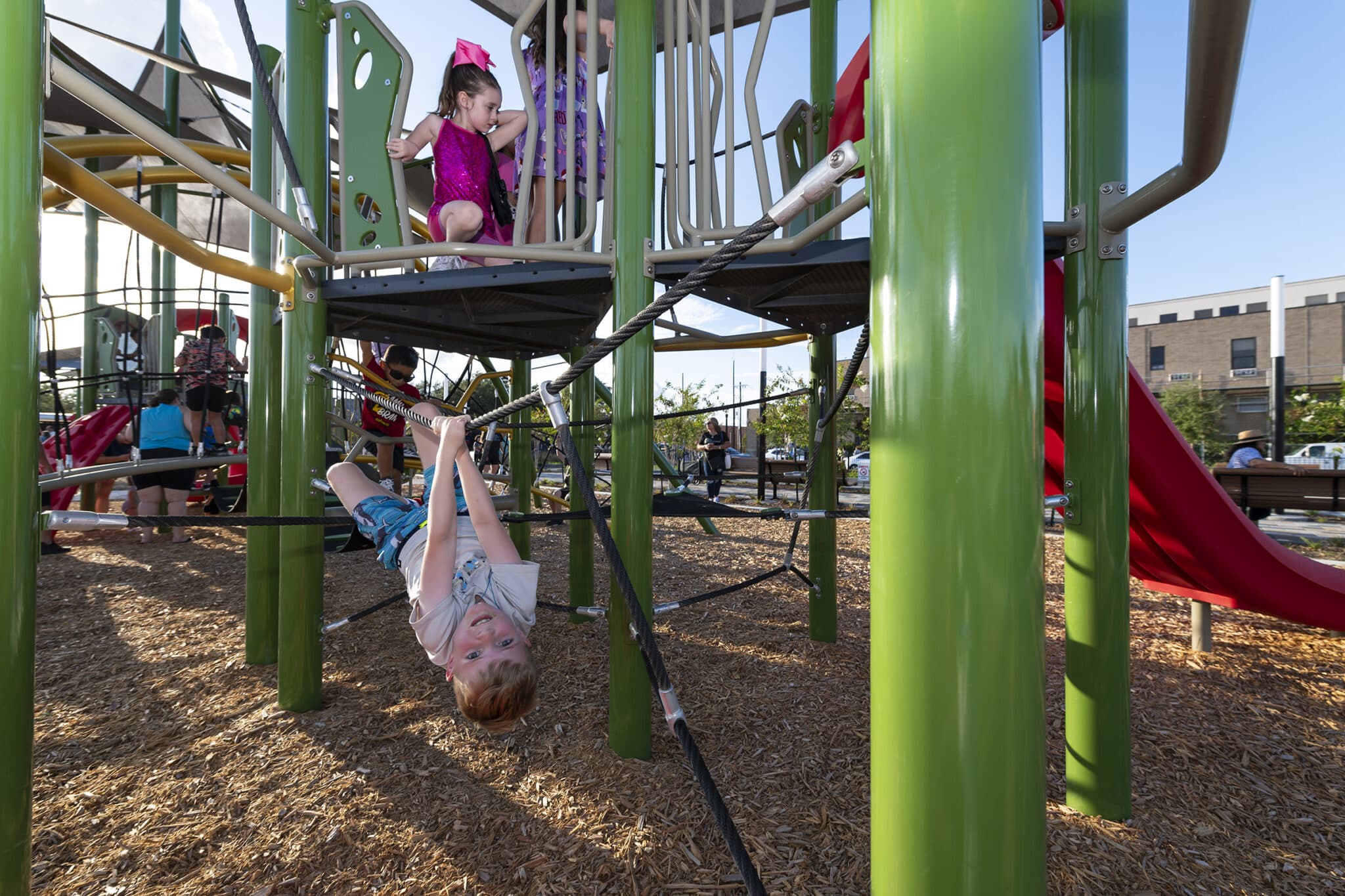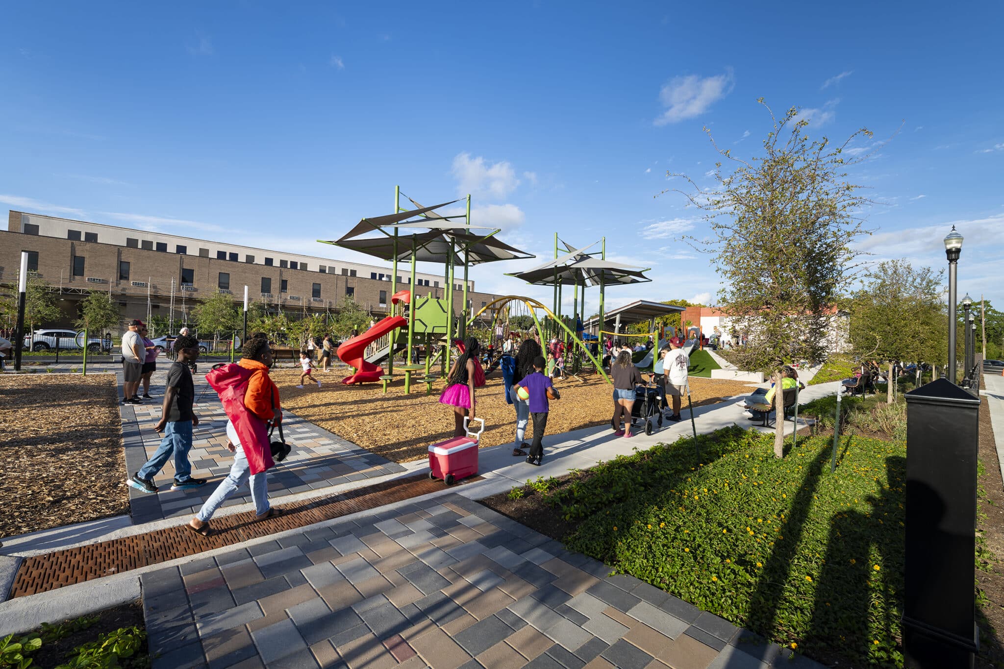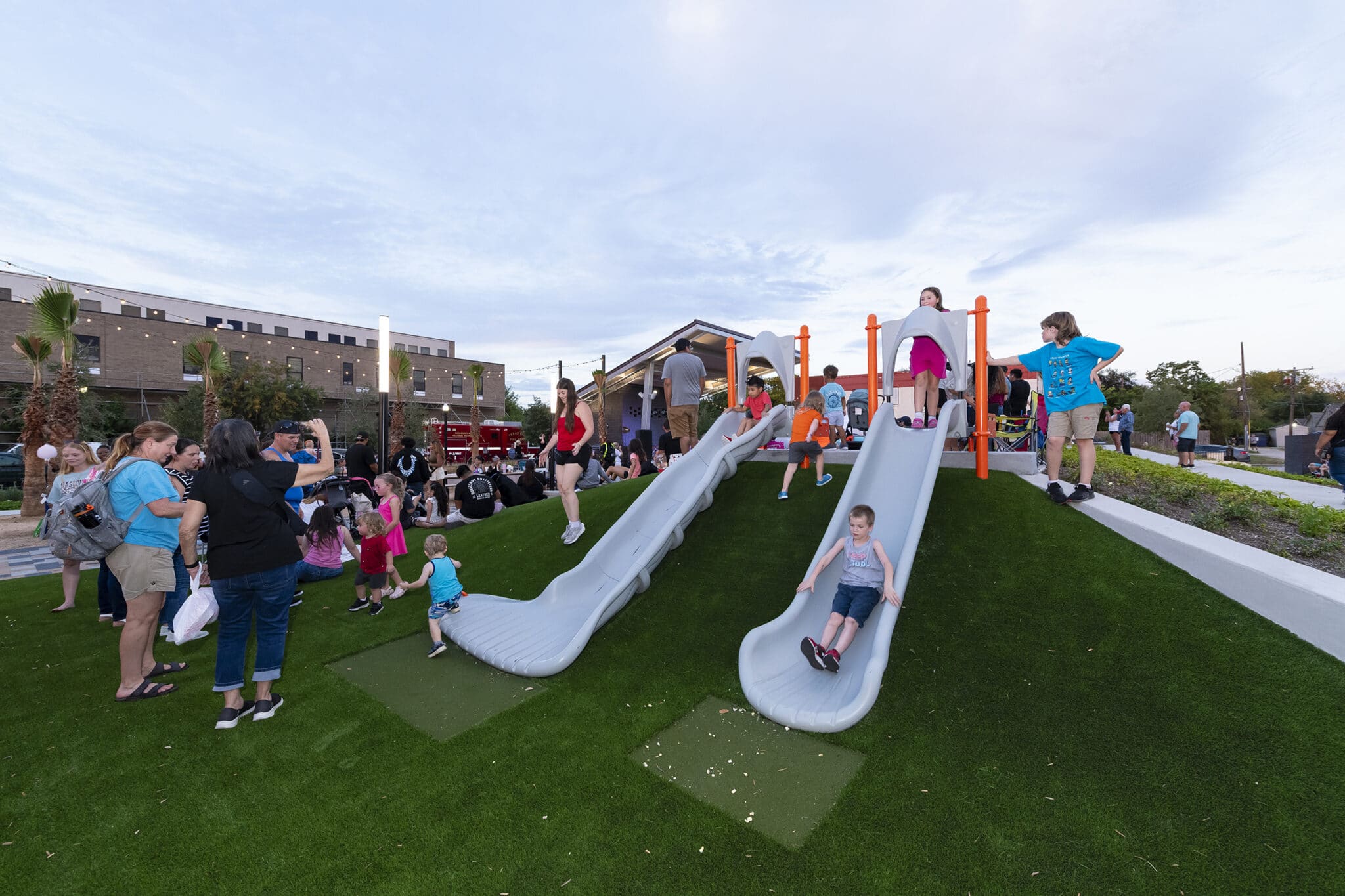 Community Plaza is thoughtfully designed to host a wide variety of programming within its compact urban footprint. Highlights include a playground, a water feature, an expansive activity lawn, an activity mound for creative play, and a dog park complete with a splash pad for four-legged visitors.