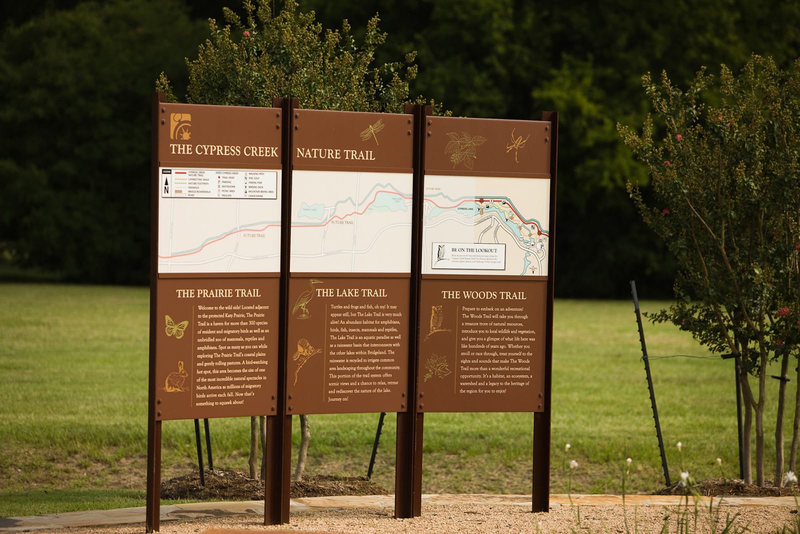 Lakeland Village is one of four villages within the Bridgeland community. This village is bordered on the north by Cypress Creek and a key amenity for this development is the focus on nature with more than 1,000 acres devoted to the Cypress Creek nature area. The six-mile multi-use trail system winds through a canopy of trees and offers an opportunity to walk, jog, or bike along a shaded path. Wildlife observation areas offer glimpses of some of the 140 species of birds that frequent this habitat. Educational signage along the trail helps visitors learn about the environment. The trailhead for the Cypress Creek Trail is Oak Meadow Park, a 30-acre wooded park that offers a picnic area, an 18-hole disc golf course, a fishing pier on a stocked lake, and a covered pavilion with restrooms. Bridgeland amenities include more than 3,000 acres of waterways, lakes, trails, parks, and open space. The 10,000-acre community is home to 65,000 households