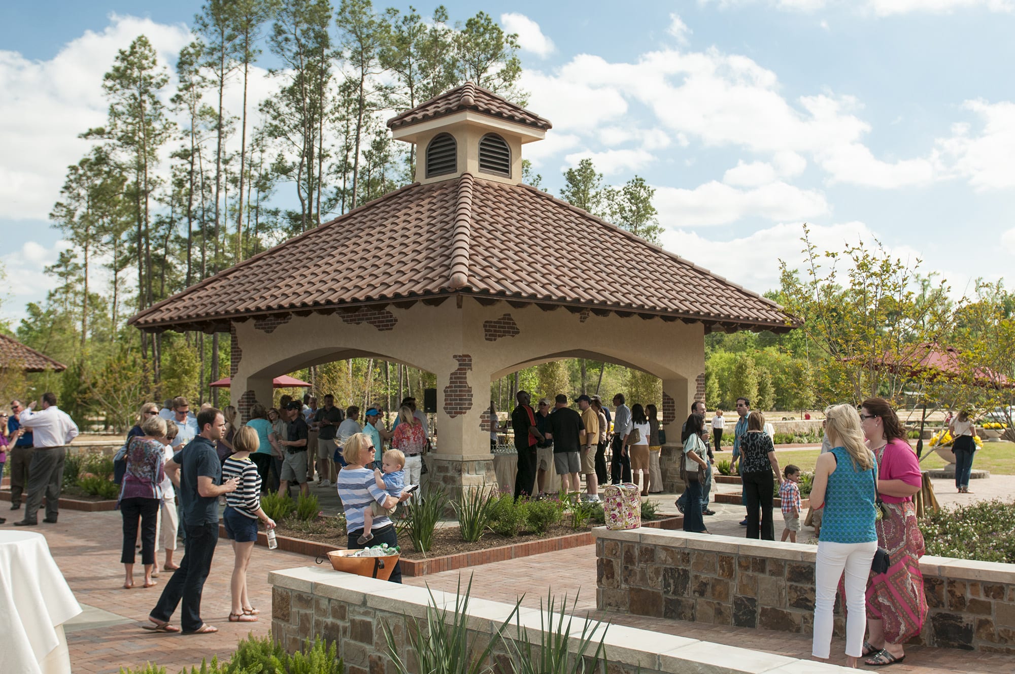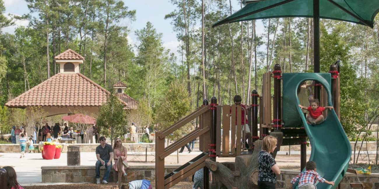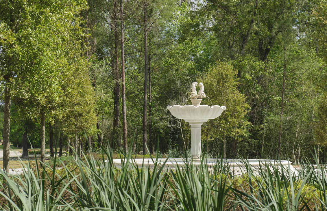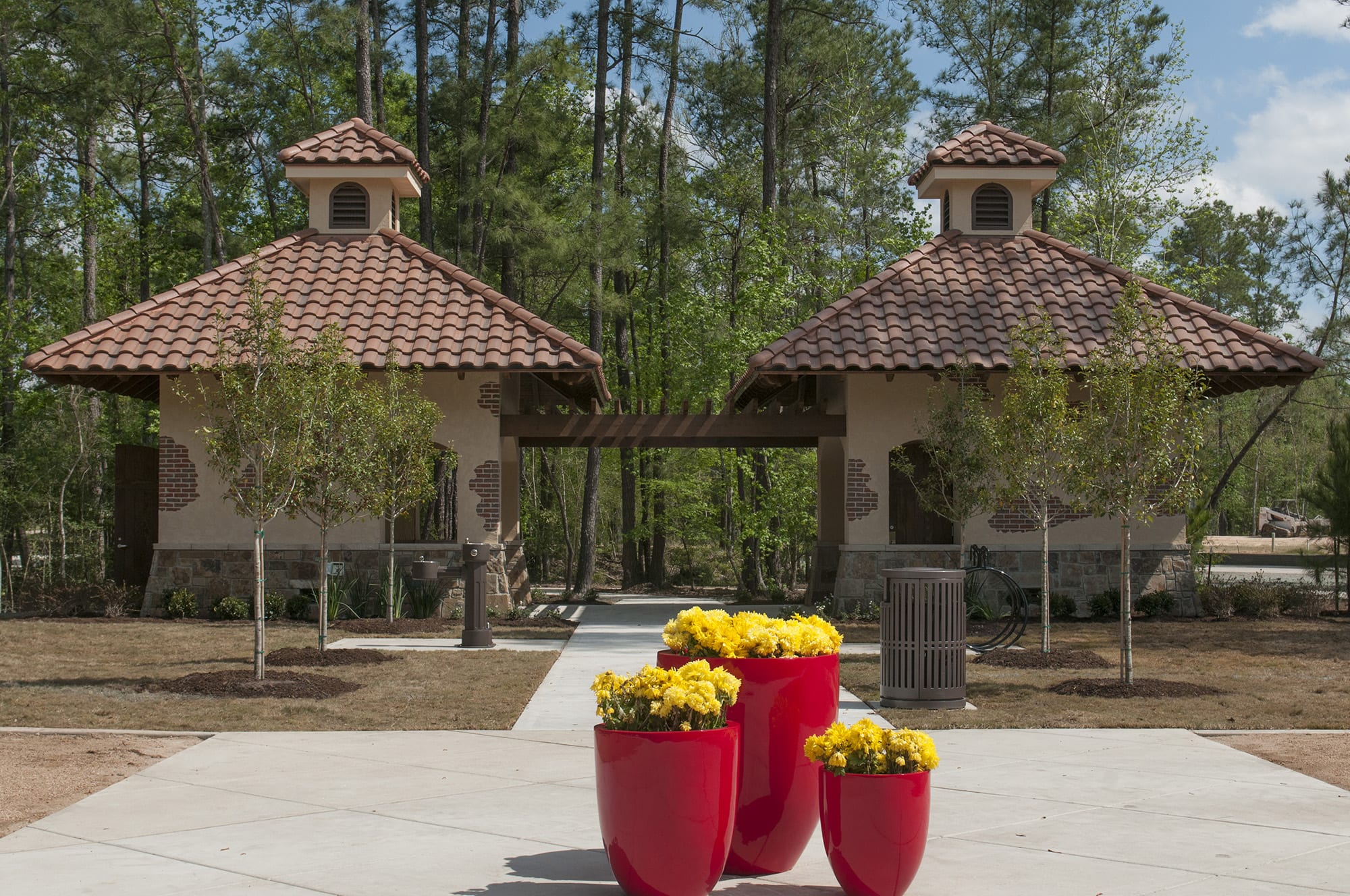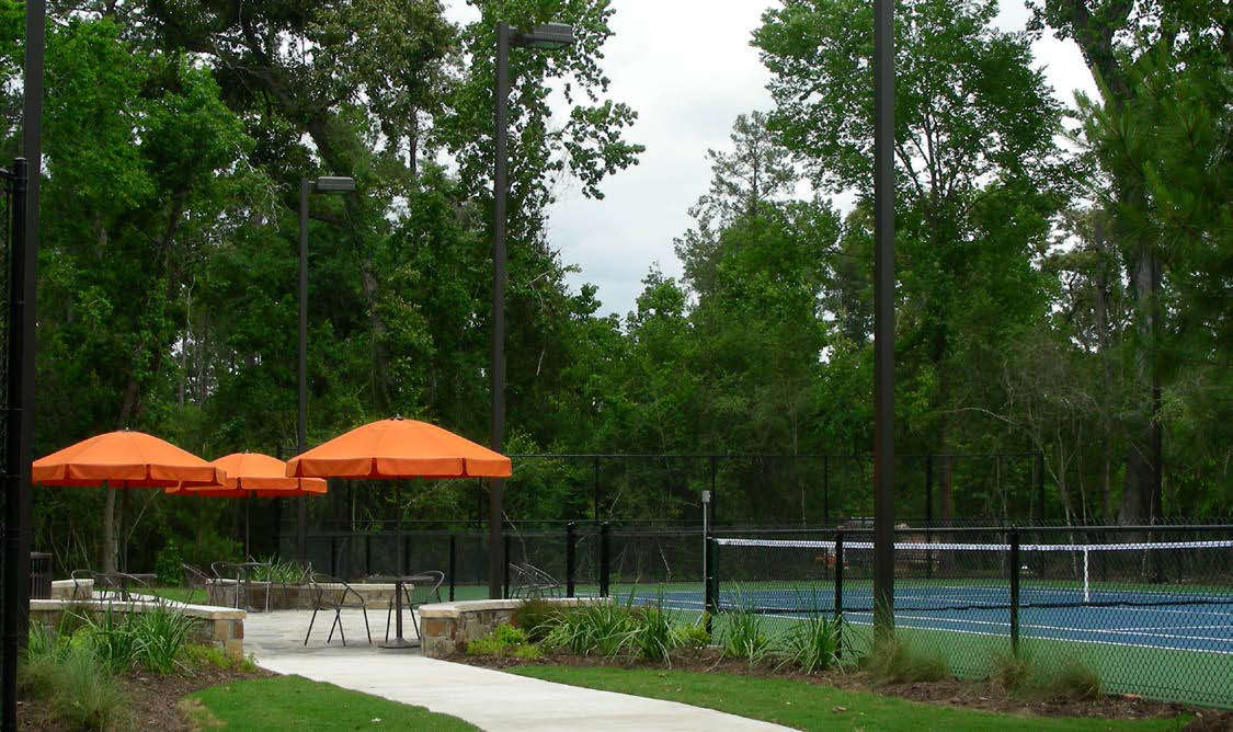 Fazio Park is a Tuscan-themed private residential space inside Carlton Woods at Creekside Village in The Woodlands. With a formal design aesthetic, the 6.25 acres includes a sunken garden in the center of the park that is flanked by an allee of live oaks set in decomposed granite surrounded by movable furnishings. An open-air custom pavilion serves as a signature icon to the space. There is also a sprayground, a fountain, a mail kiosk, and an event lawn. The nature-themed playground has seatwalls set within the trees. Also part of the park’s features are a restroom building, a pump house, tennis courts with central courtyard, half basketball court, parking, and 3/4 miles of walkways and trails.