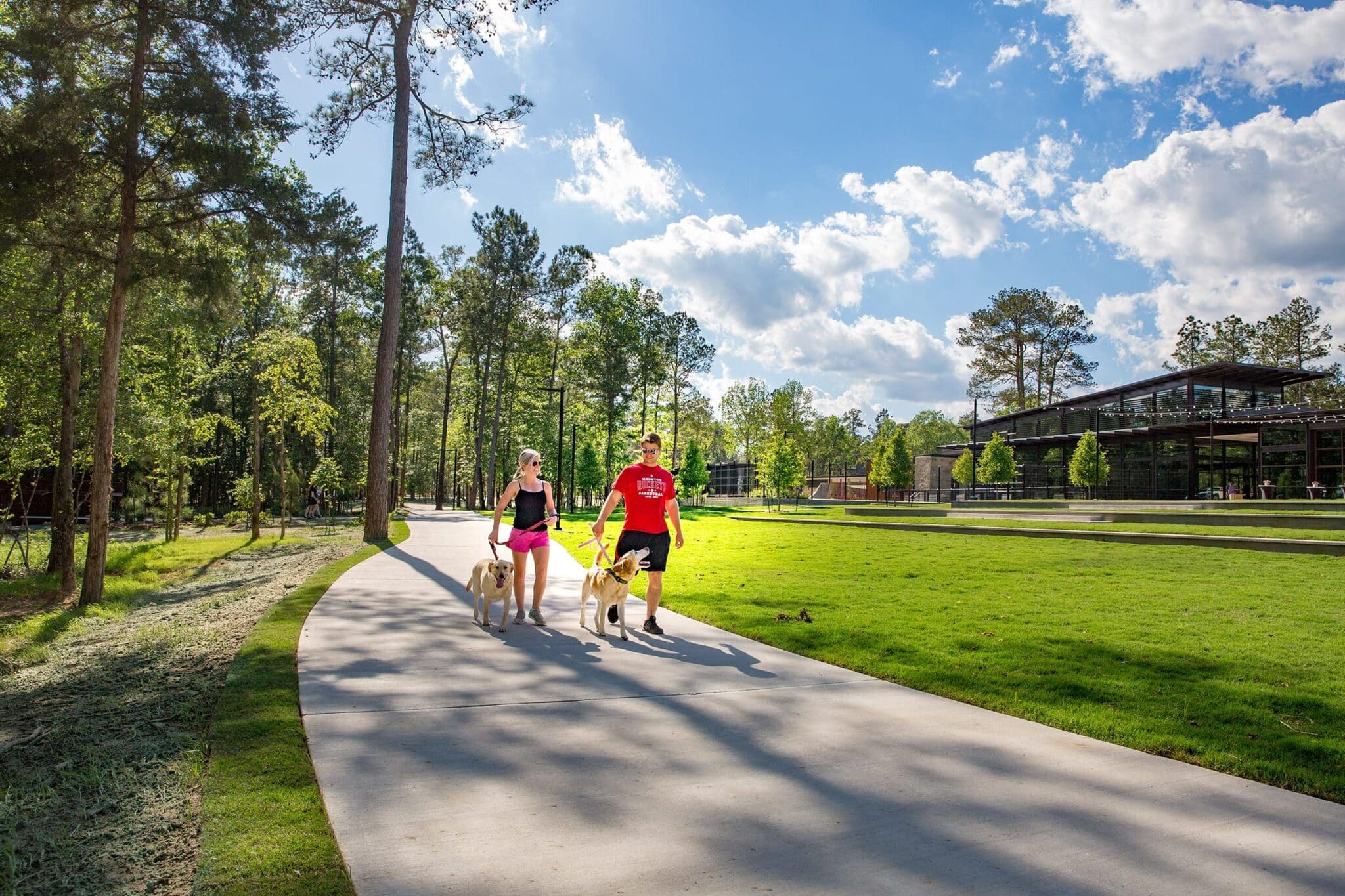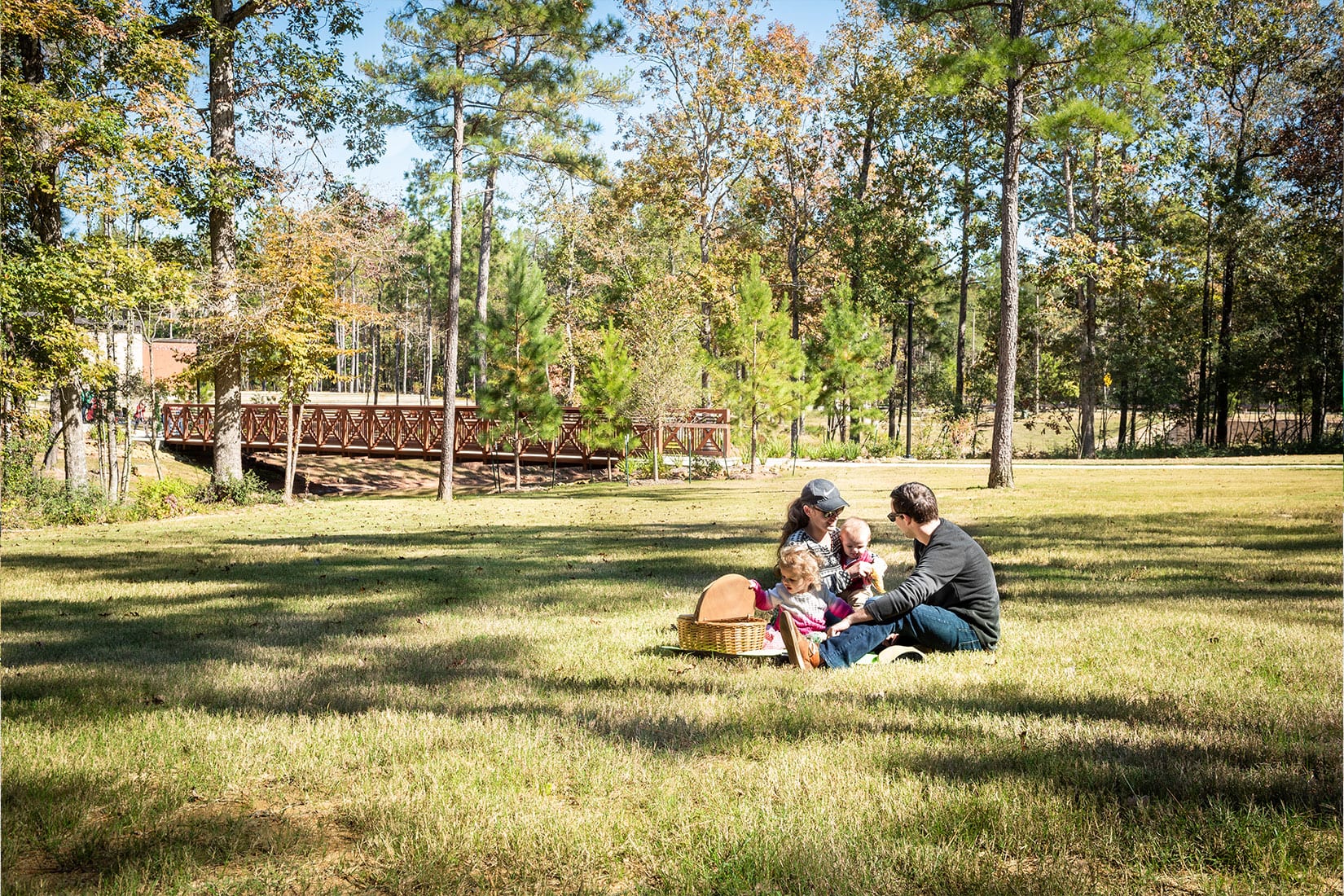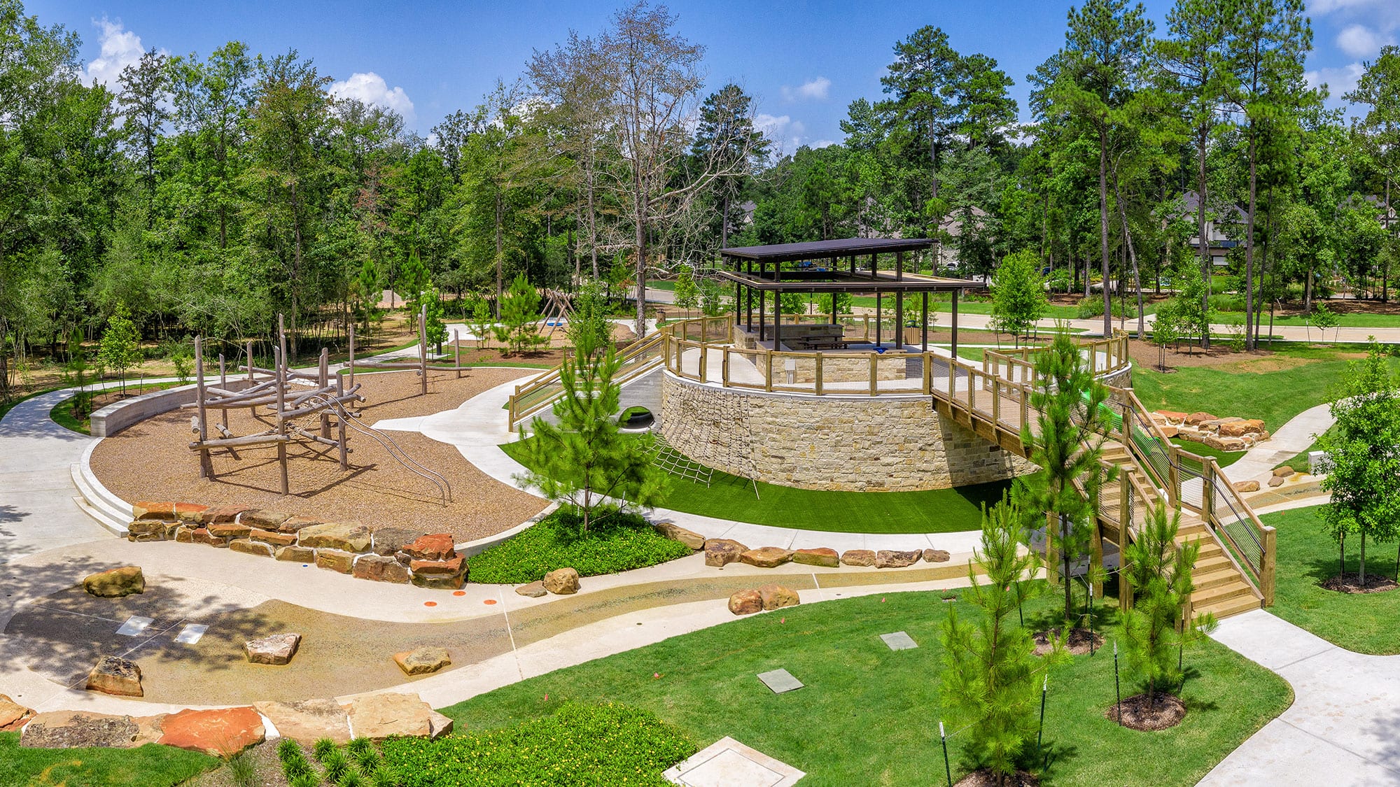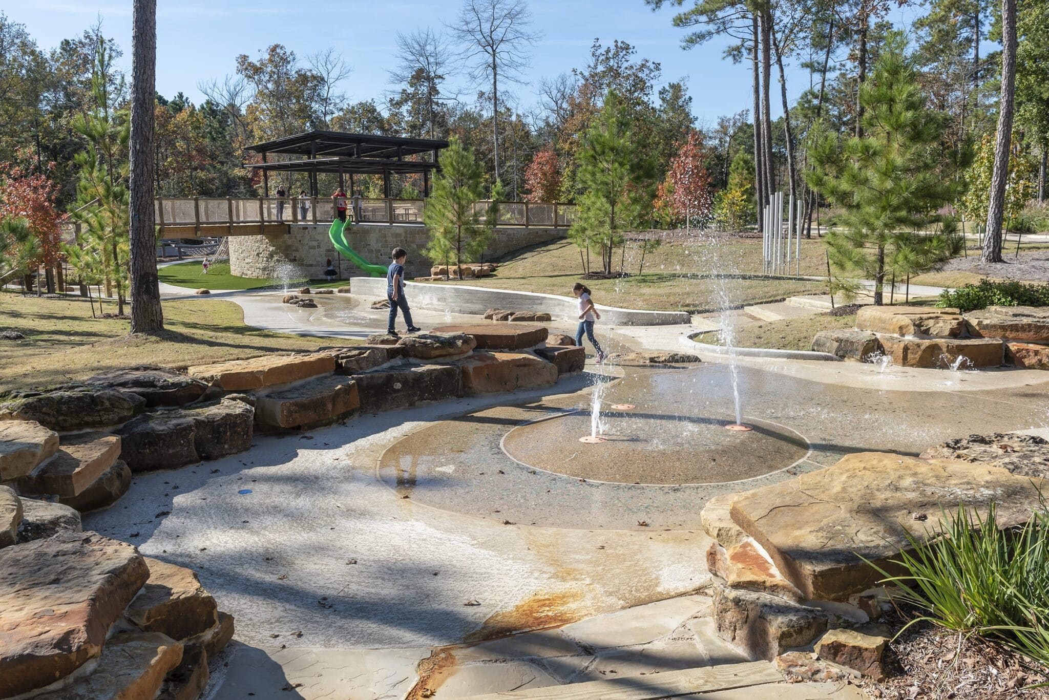 Nestled into the playground is an interactive sprayground stream which winds through the playground. The playground pavilion is a great place to relax and take in views of the site. The playground invites children and adults alike to explore and have fun. Founders Park is divided by a natural stream crossing through the site. A pedestrian bridge connects the amenity center, pool, and playground on the north side to the dog park, tennis courts, and open play areas on the south side. The stream bed remains largely untouched and is a great place to explore the natural beauty of The Woodlands Hills.