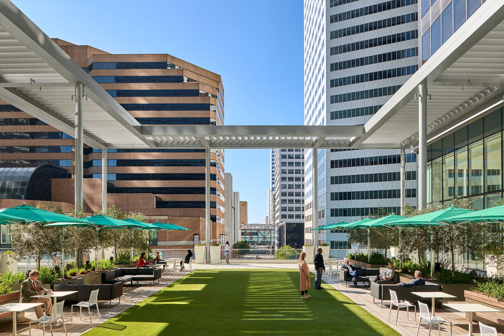 The central plaza features a digital water wall, seating, and flexible entertainment space with seamless street-level access. Roof deck terraces offer outdoor co-working spaces to foster collaboration and extend the traditional working environment to the outdoors. Through a combination of sustainable amenities and a park-like atmosphere, Houston Center added 162 trees and nearly 24,000 square feet of greenspace to the urban fabric of downtown while creating places for people to gather and setting the stage for the future.