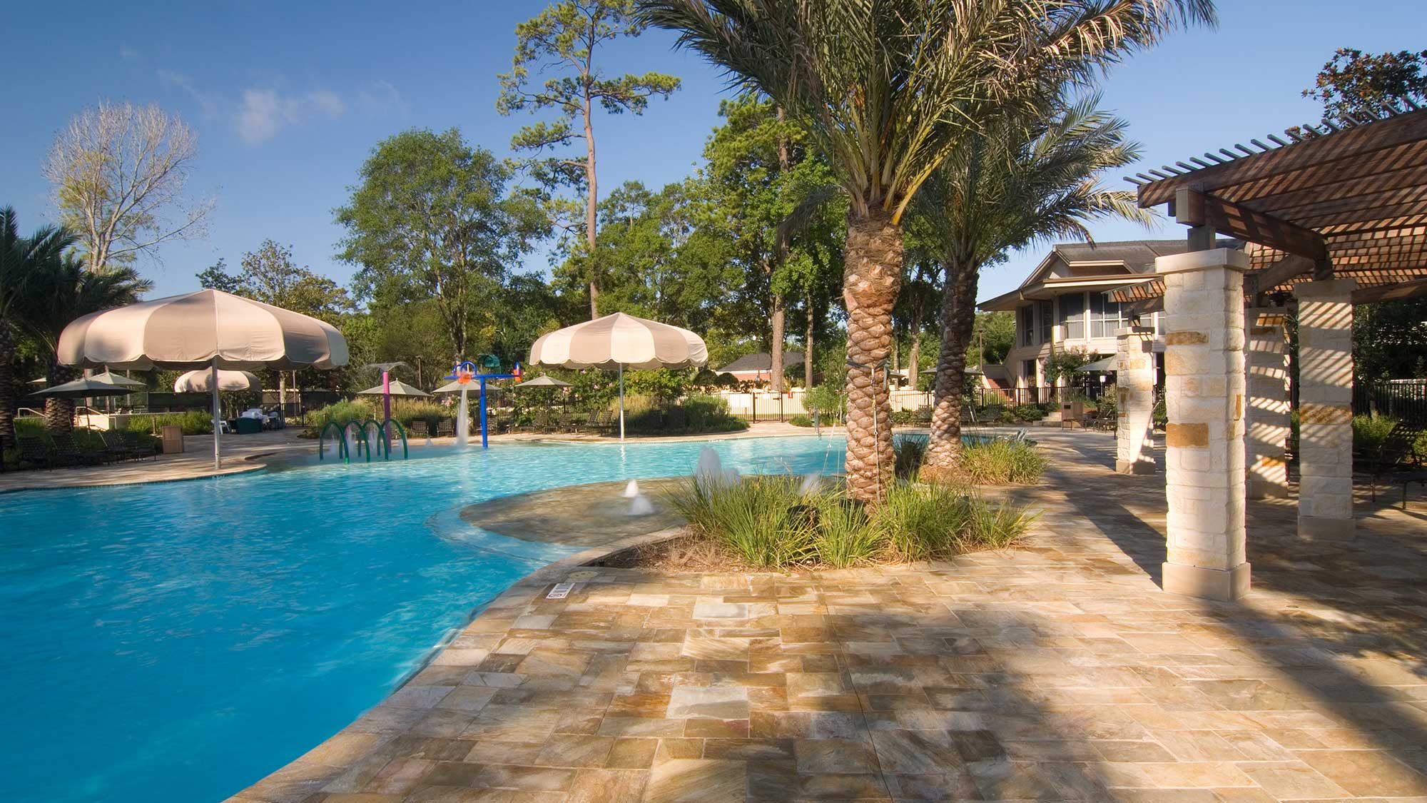 Clark Condon worked with the Houston Racquet Club to create a new aquatics area. The plan included demolishing two tennis courts to make room for a state-of-the-art recreation and swim team pool. The new complex focused on the desires of young members with growing families. The project included a beach entry, water slide, and spray toys surrounded with lush landscaping.
