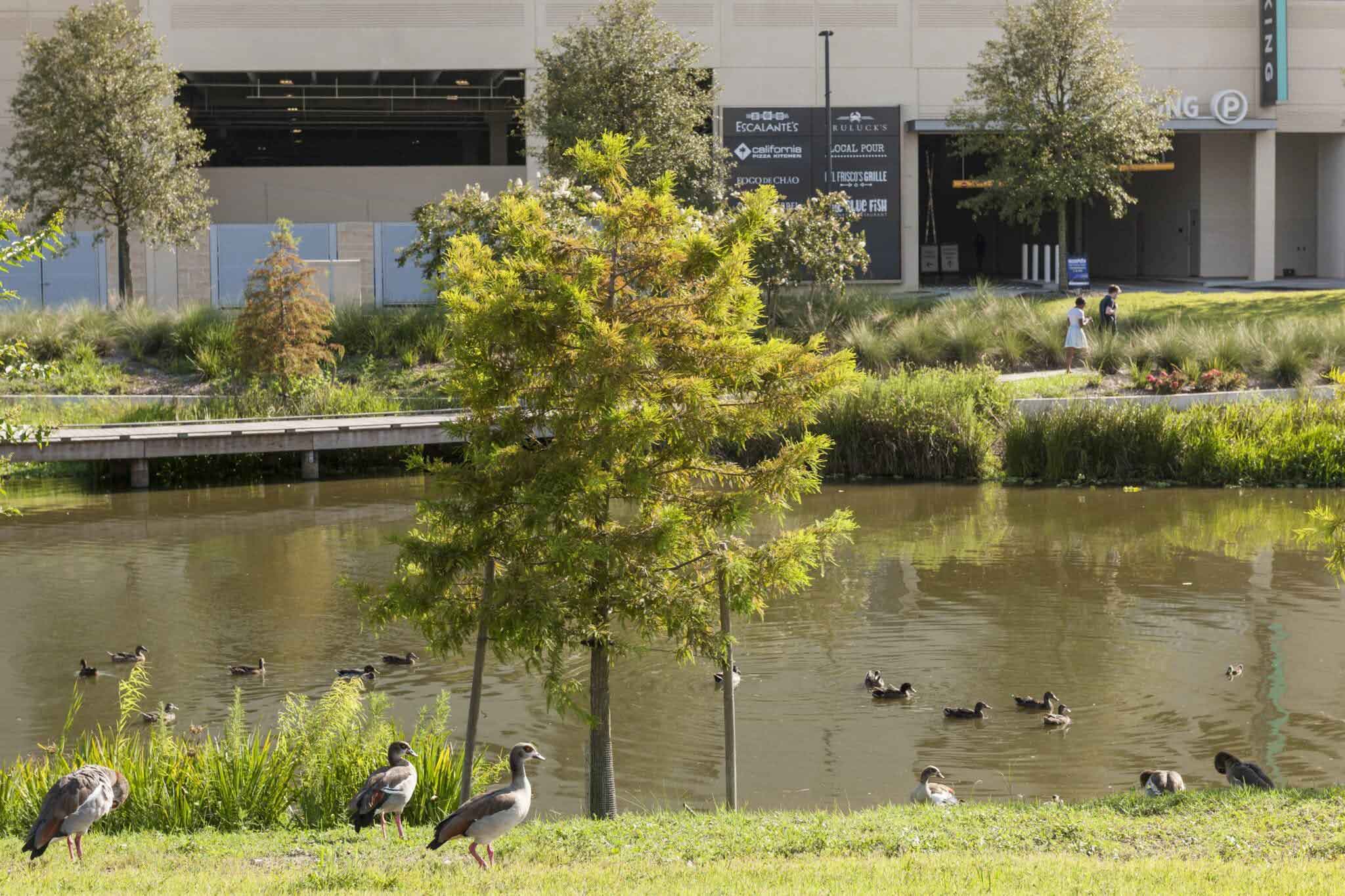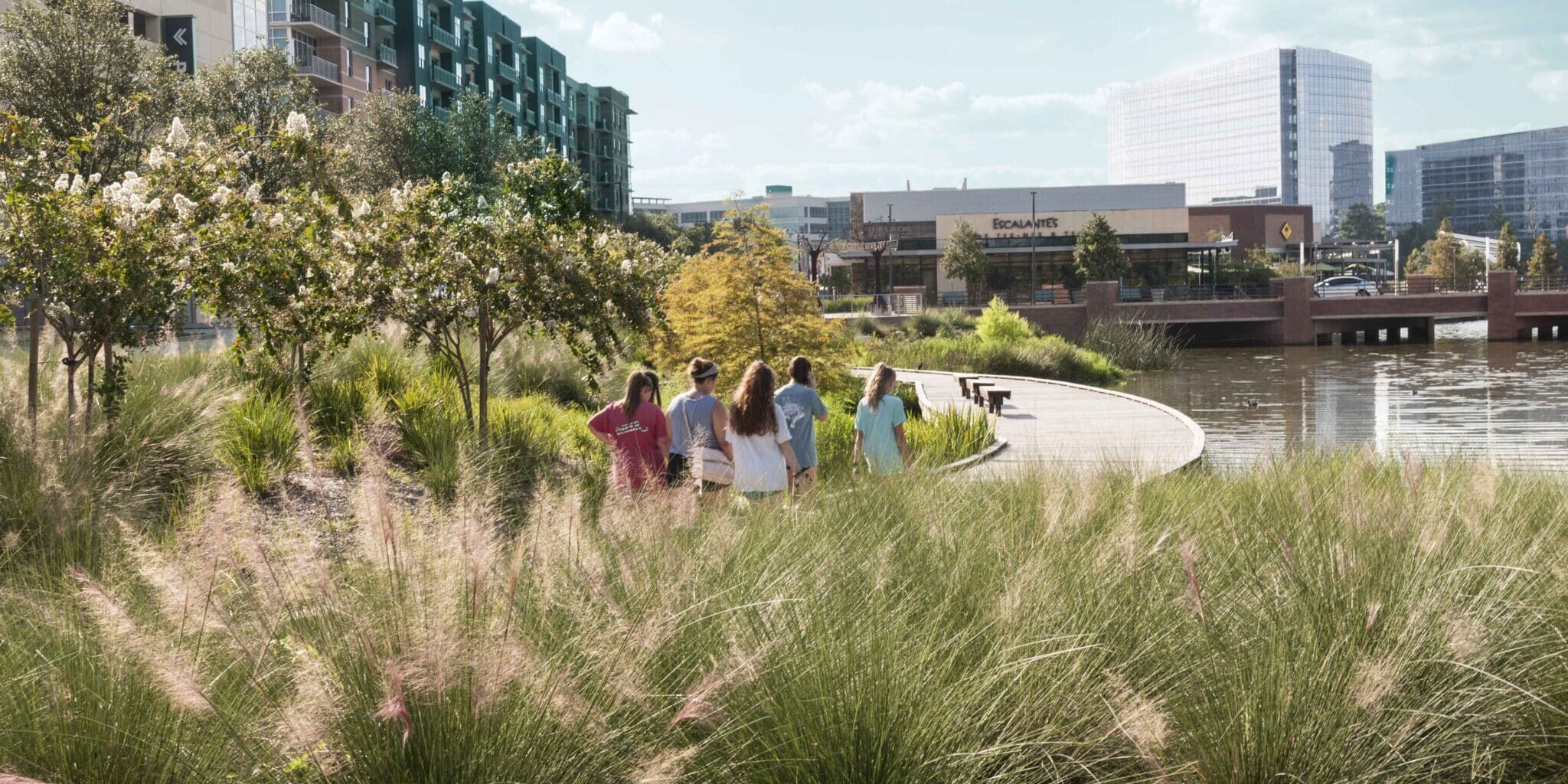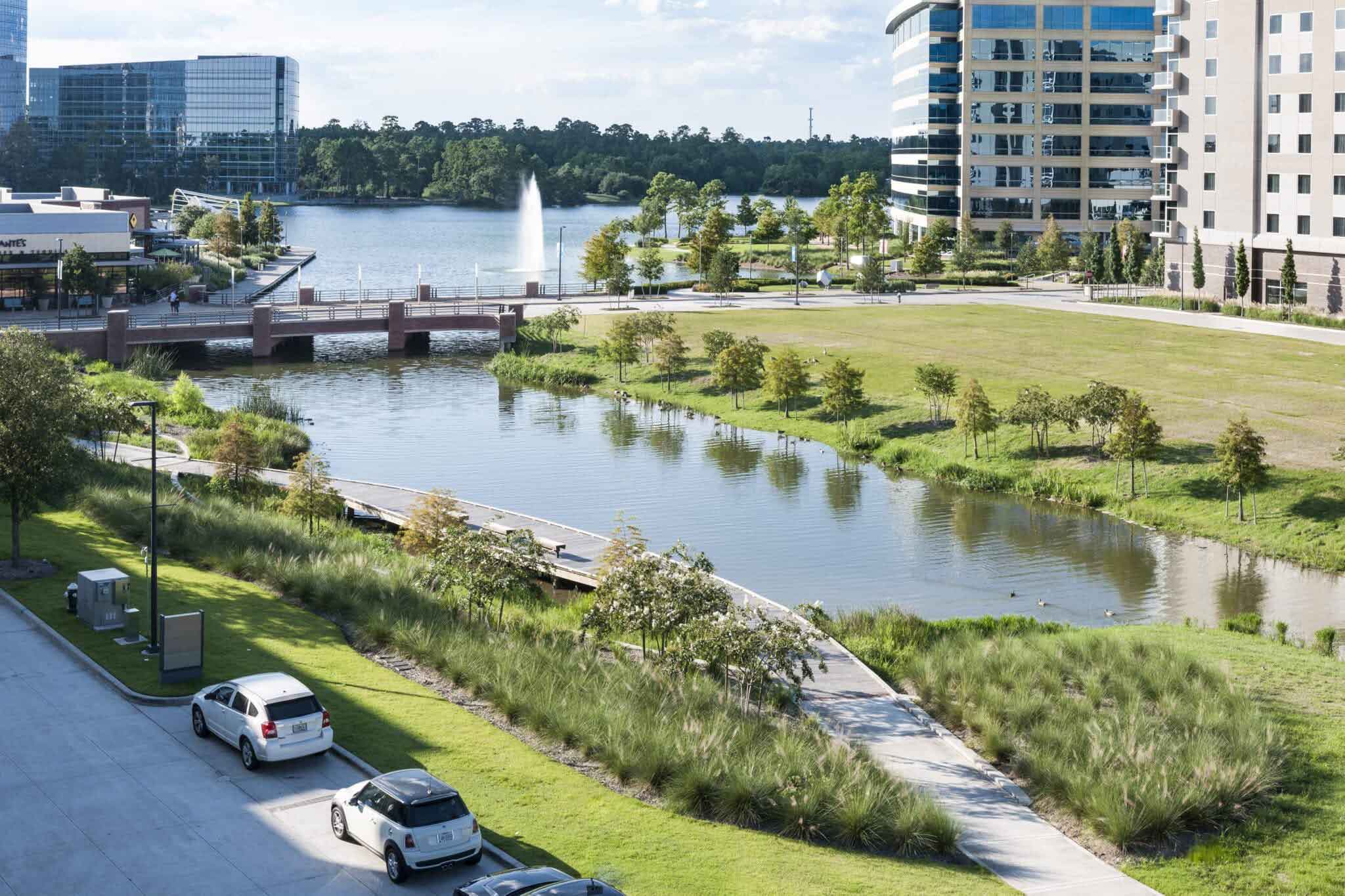 Hughes Landing is a 66-acre mixed-use development nestled between Town Center and Research Forest on the edge of Lake Woodlands. The development includes Class A office buildings, a hotel, apartments, retail, and grocery. Clark Condon’s role was to create an entry experience to Hughes Landing. The challenges were working with existing delineated wetlands, enhancing them, and programming the area to attract people to visit, enjoy, and explore. The open green space transitions the mixed-use development into the natural surroundings of Lake Woodlands. The area includes boardwalk trails, sloping green spaces, low maintenance, and native plantings which can be enjoyed when strolling or resting along the boardwalk or from the overlook plaza which features creatively inspired artwork by John Runnels. The open space provides a natural habitat for wildlife and a peaceful, serene environment for visitors and those who work nearby.