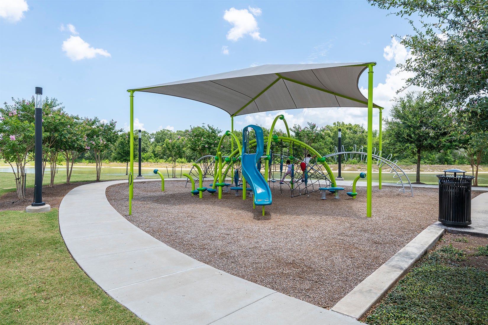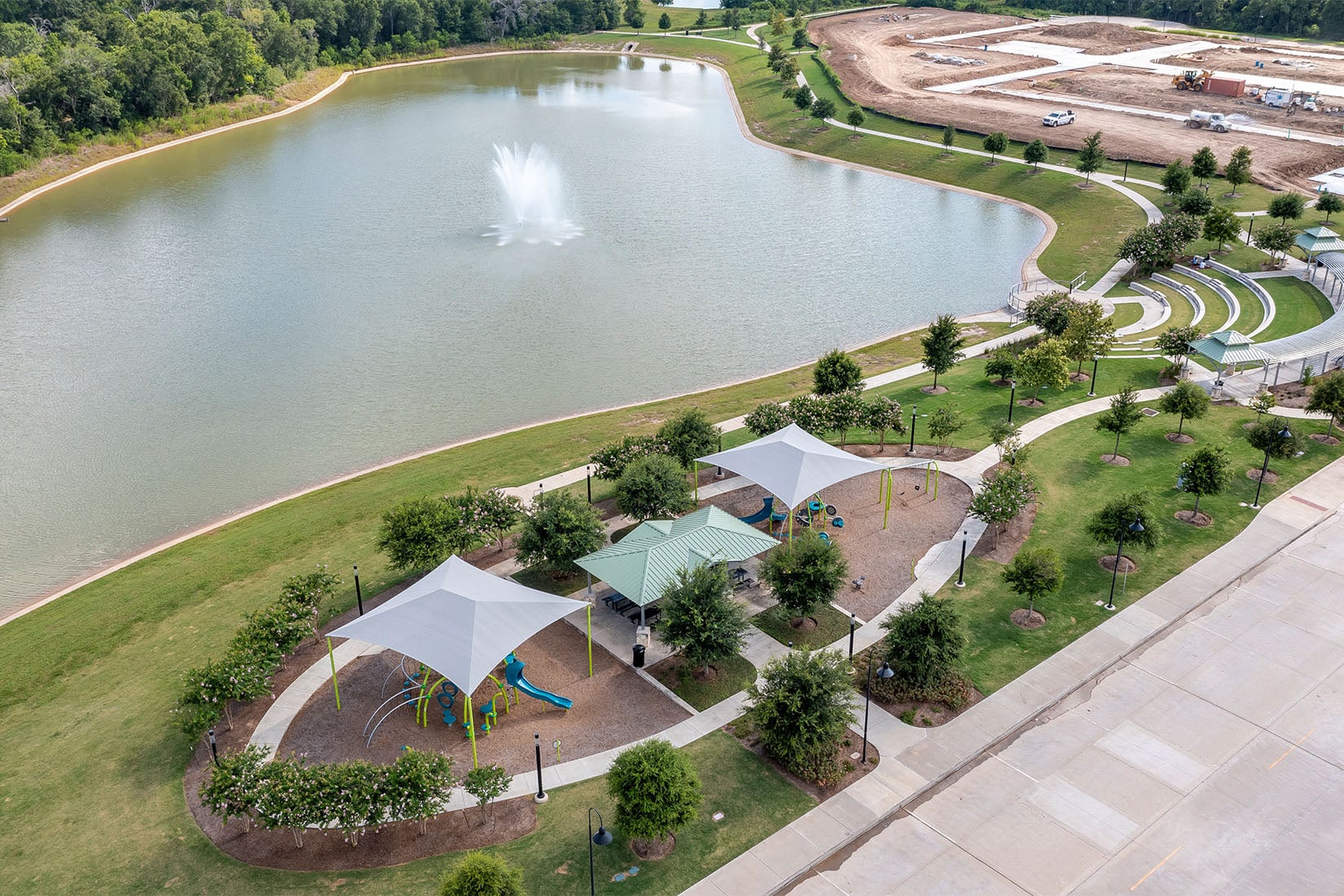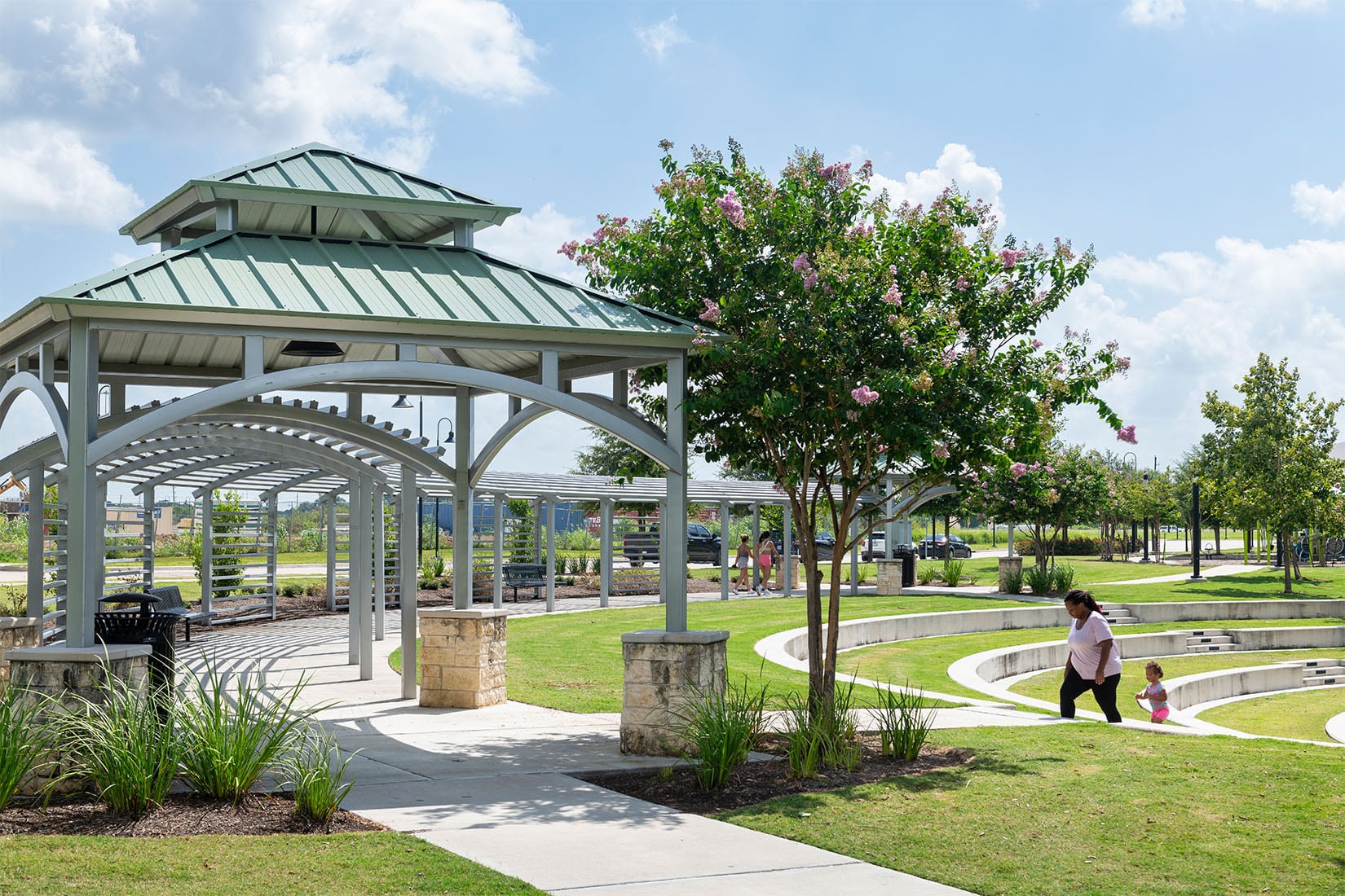 Ivy Pond, located within the Lower Kirby District of Pearland, is approximately three acres of dedicated park space. Clark Condon’s landscape design was structured around the centralized water feature. A terraced lawn overlooks the fountains and offers ample seating for respite and socializing while a boardwalk allows park visitors to stroll along the water’s edge. Shade structures with a custom trellis provide cover, and a large open-air pavilion hosts community events and gatherings. To connect to the City of Pearland’s regional trail system, 5,000 linear feet of trails were implemented with a 130-foot pedestrian bridge that crosses Clear Creek.