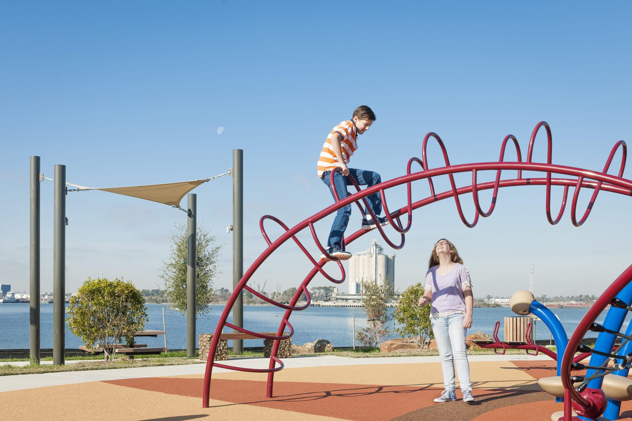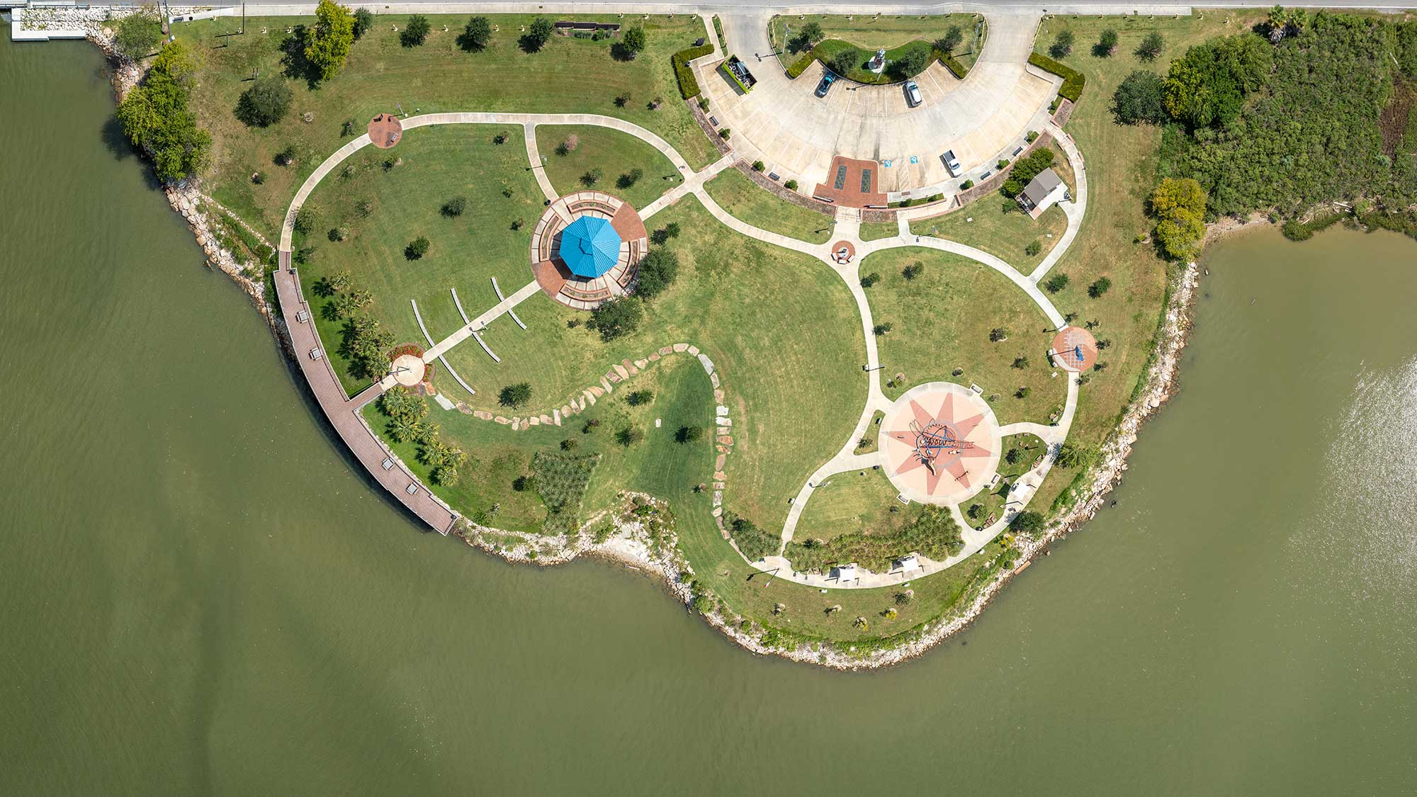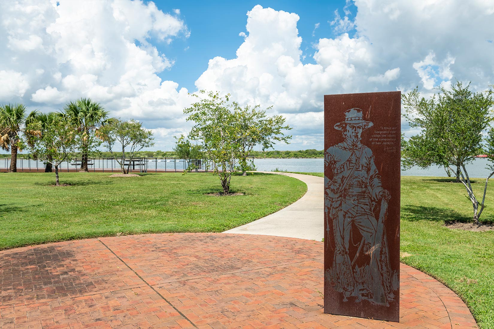HIGHLIGHTS: | Regional Park on Houston Ship Channel. Historic-Themed Park. Former Construction Spoil Site. Life-Size Steel Graphics. Playground. Large, Open-Air Pavilion with Custom Granite Inlay. Picnic Areas. Open Space. Native Grasses + Plantings. Boardwalk. Amphitheater. Walking Trails. |