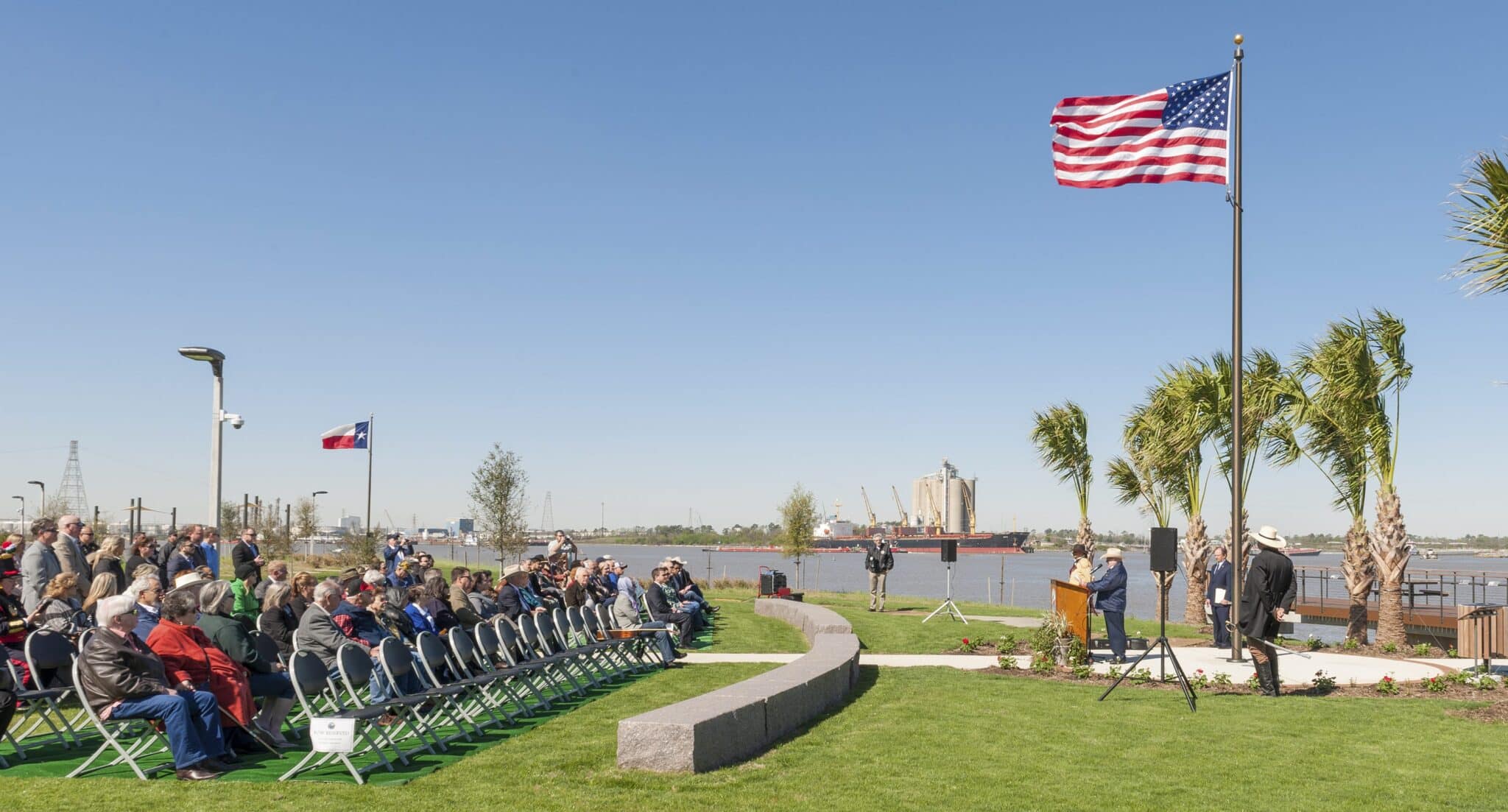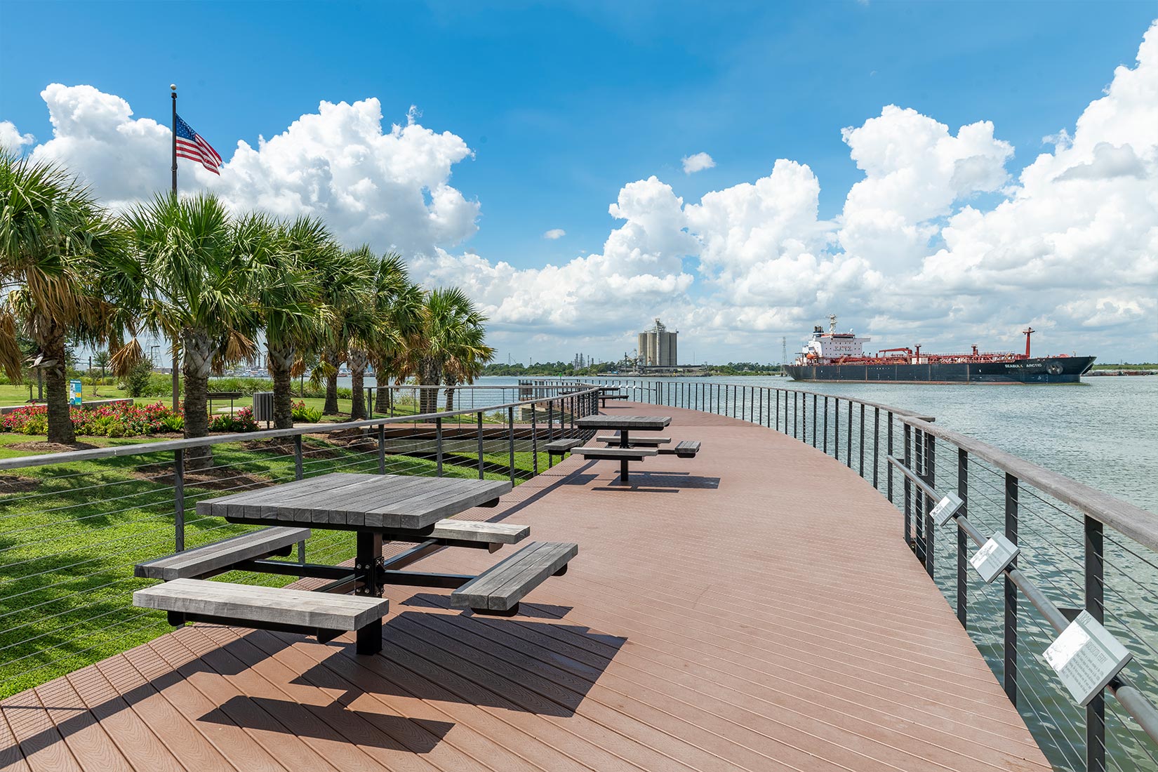 Picnic tables and shade sails among the native grasses, trees and boulders, provide shaded seating with unrestricted views of the ship channel and the passing maritime vessels. Additionally, there’s a curved boardwalk overlooking the ship channel. A large, open pavilion offers shade and seating. A custom floor inlay of etched granite outlines the configuration of the ship channel and various landmarks stretching from the Gulf of Mexico to the City of Houston and Port of Houston.