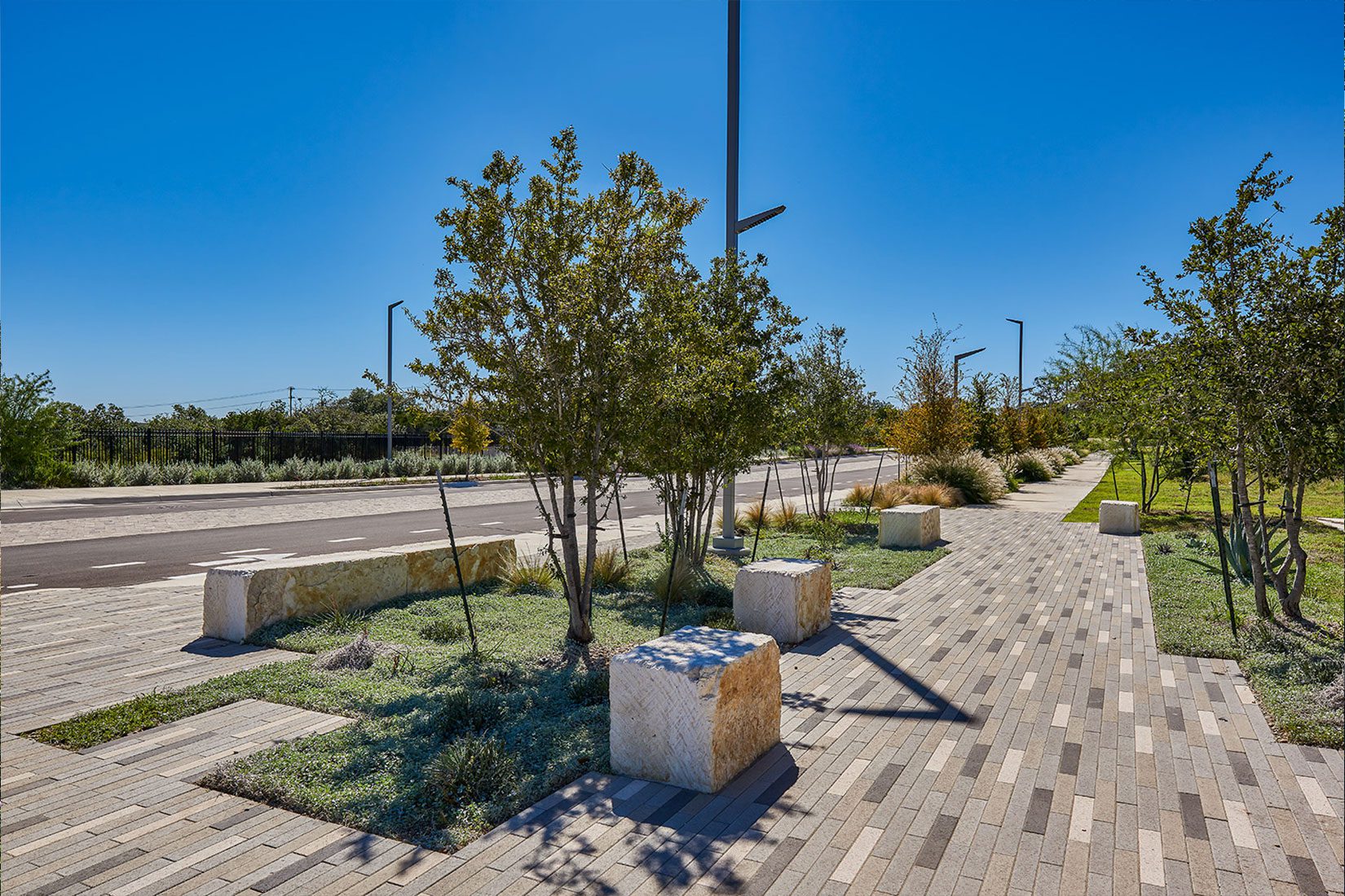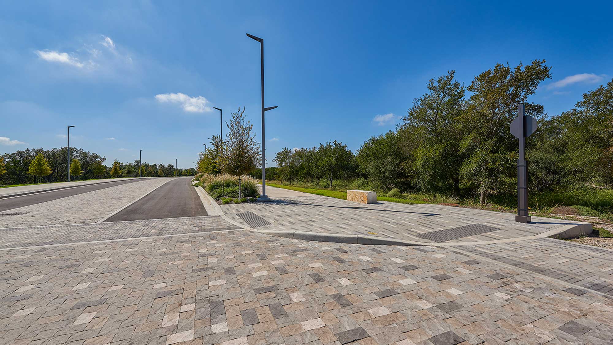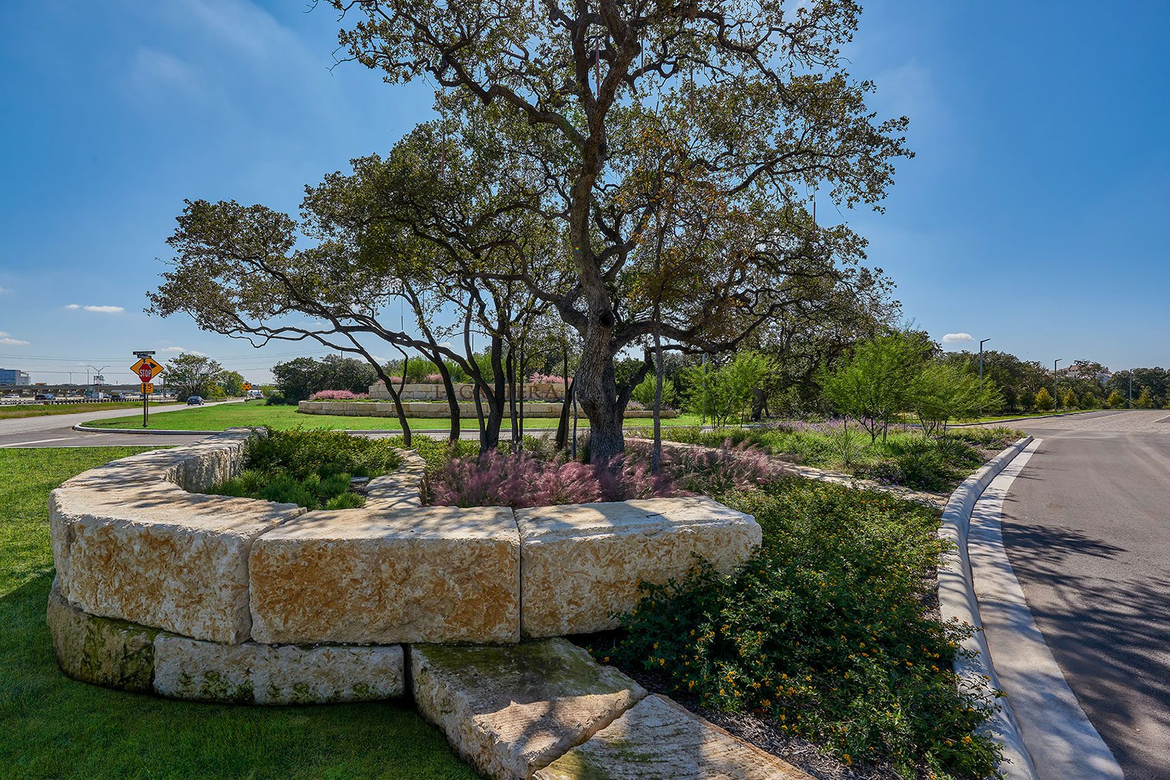 The newly installed streetscape along Via La Cantera creates a visual statement as you traverse through. The two-lane street boasts sleek new LED street and pedestrian lighting, wide sidewalks, and hill country-style planting. The planting palette includes Cedar Elms, Palo Verde trees, multi-trunk Live Oaks, native grasses, and perennials. The material palette consists of a rich mixture of soft-colored, textured pavers punctuated by pockets of planting with limestone blocks for accents. These elements establish a signature landscape for Via La Cantera.