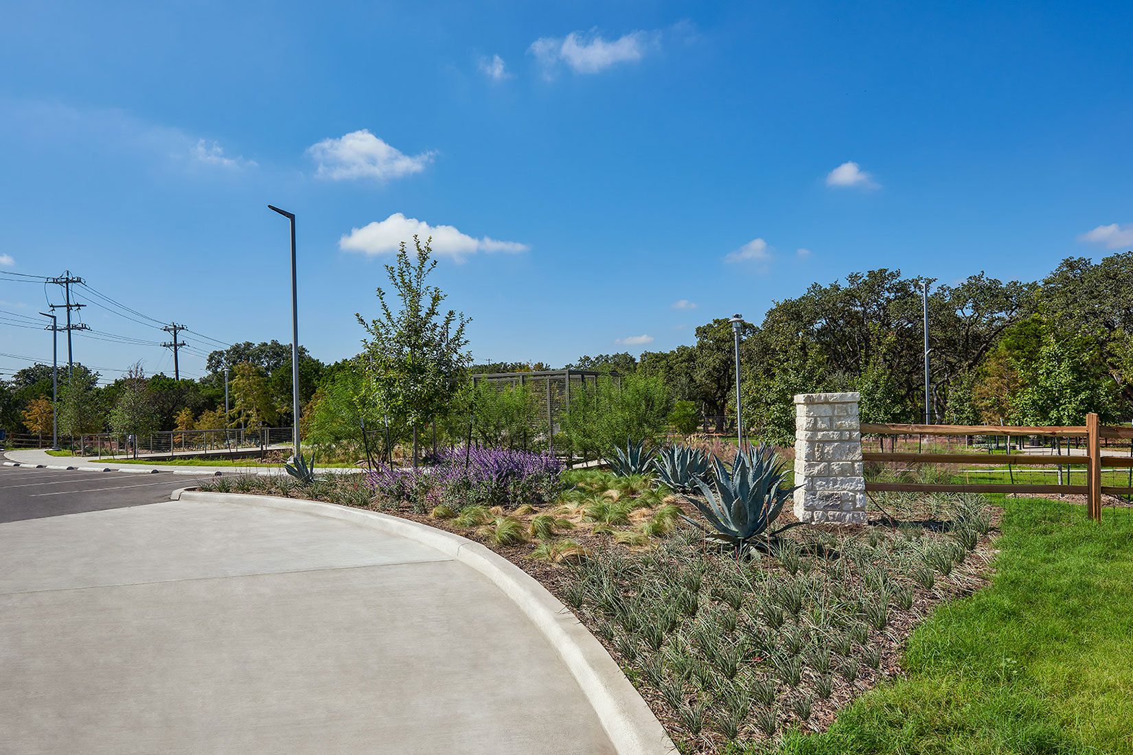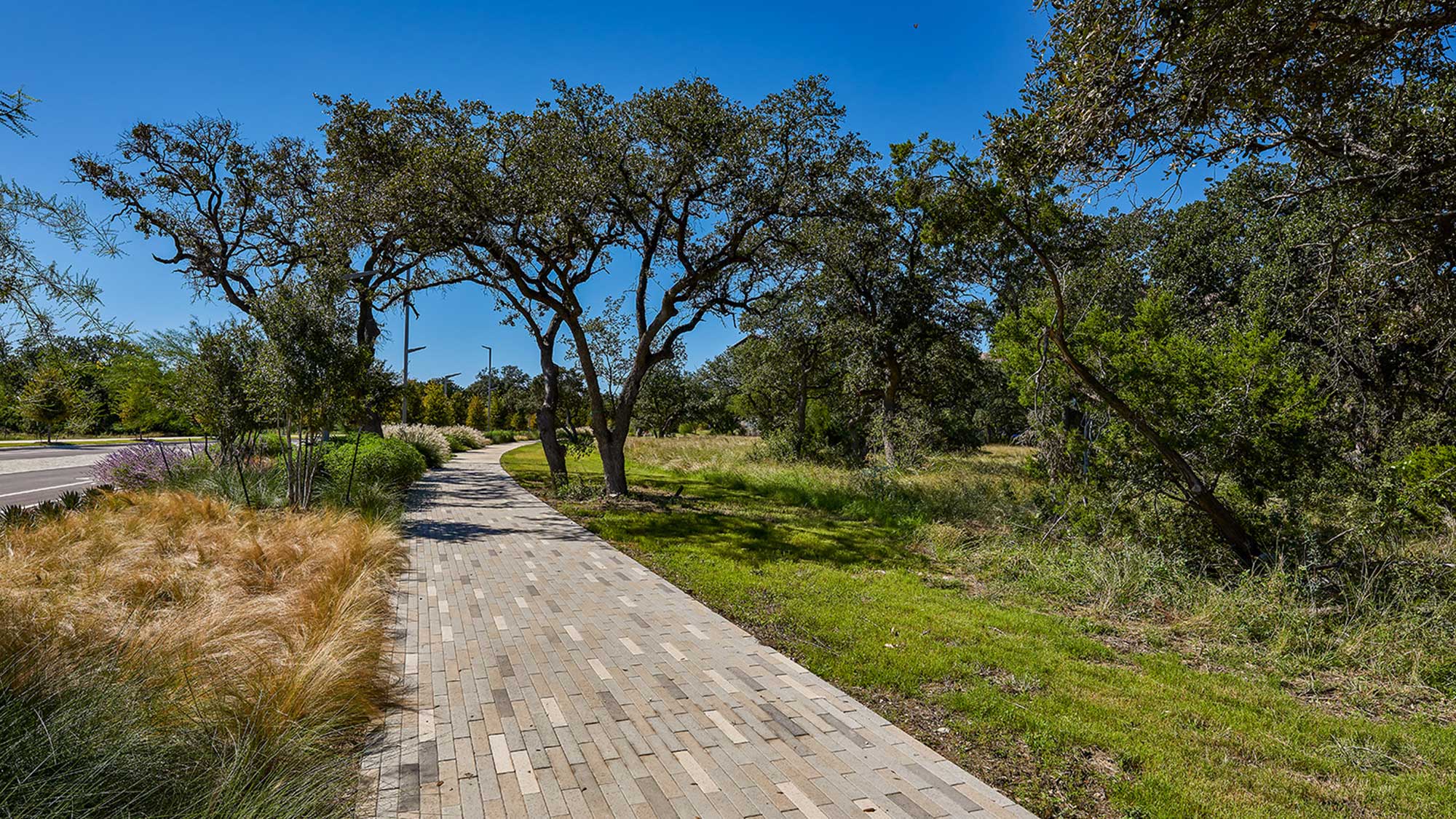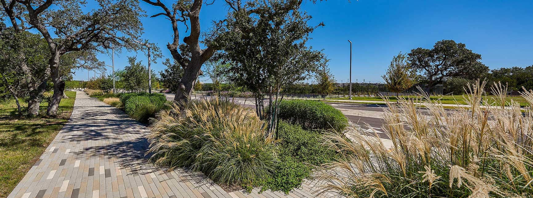 The newly installed streetscape along Via La Cantera creates a visual statement as you traverse through. The two-lane street boasts sleek new LED street and pedestrian lighting, wide sidewalks, and hill country-style planting. The planting palette includes Cedar Elms, Palo Verde trees, multi-trunk Live Oaks, native grasses, and perennials. The material palette consists of a rich mixture of soft-colored, textured pavers punctuated by pockets of planting with limestone blocks for accents. These elements establish a signature landscape for Via La Cantera.