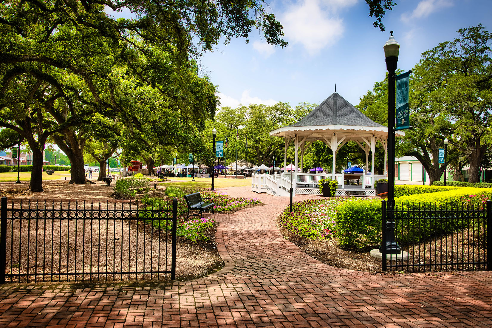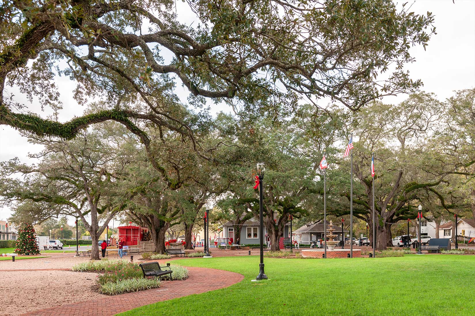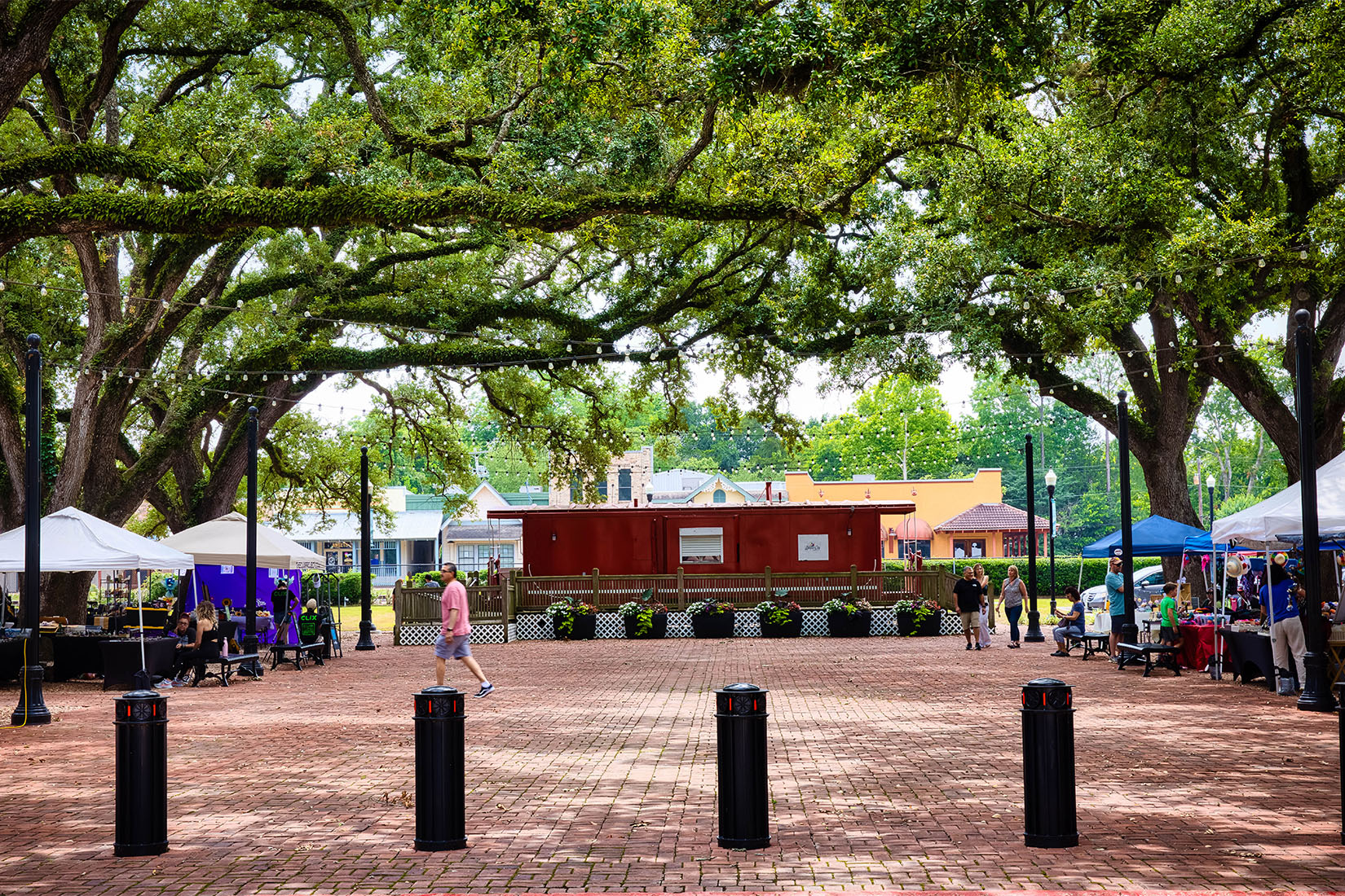 League Park, a historic park, includes iconic elements such as a gazebo, caboose and clock tower. Divided by a central plaza, the north side of the park contains more active recreation elements like basketball courts and a large play structure. The south side is more passive with large historic Butler Oak Trees, a gazebo and several seating areas. In order to meet the goals for the future vision of the park and the downtown area, elements in the park were relocated or removed providing more open space and better circulation. Half of the existing parking lot was removed to expand the park’s usable footprint. The complete refresh of the park includes clay brick pavers, new site furniture, lighting and understory planting with irrigation. The park also includes a large open grass area for outdoor concerts and movies, a large brick paved plaza compete with catenary lights for evening events and market days, as well as other improvements.