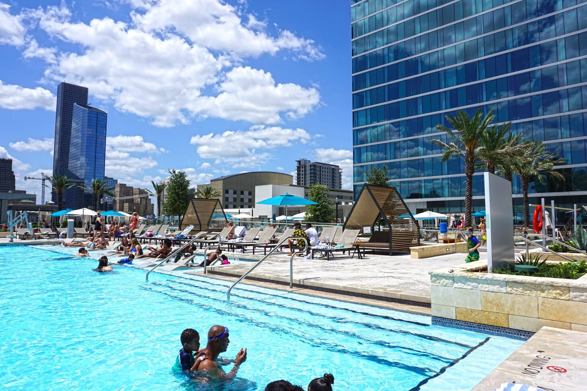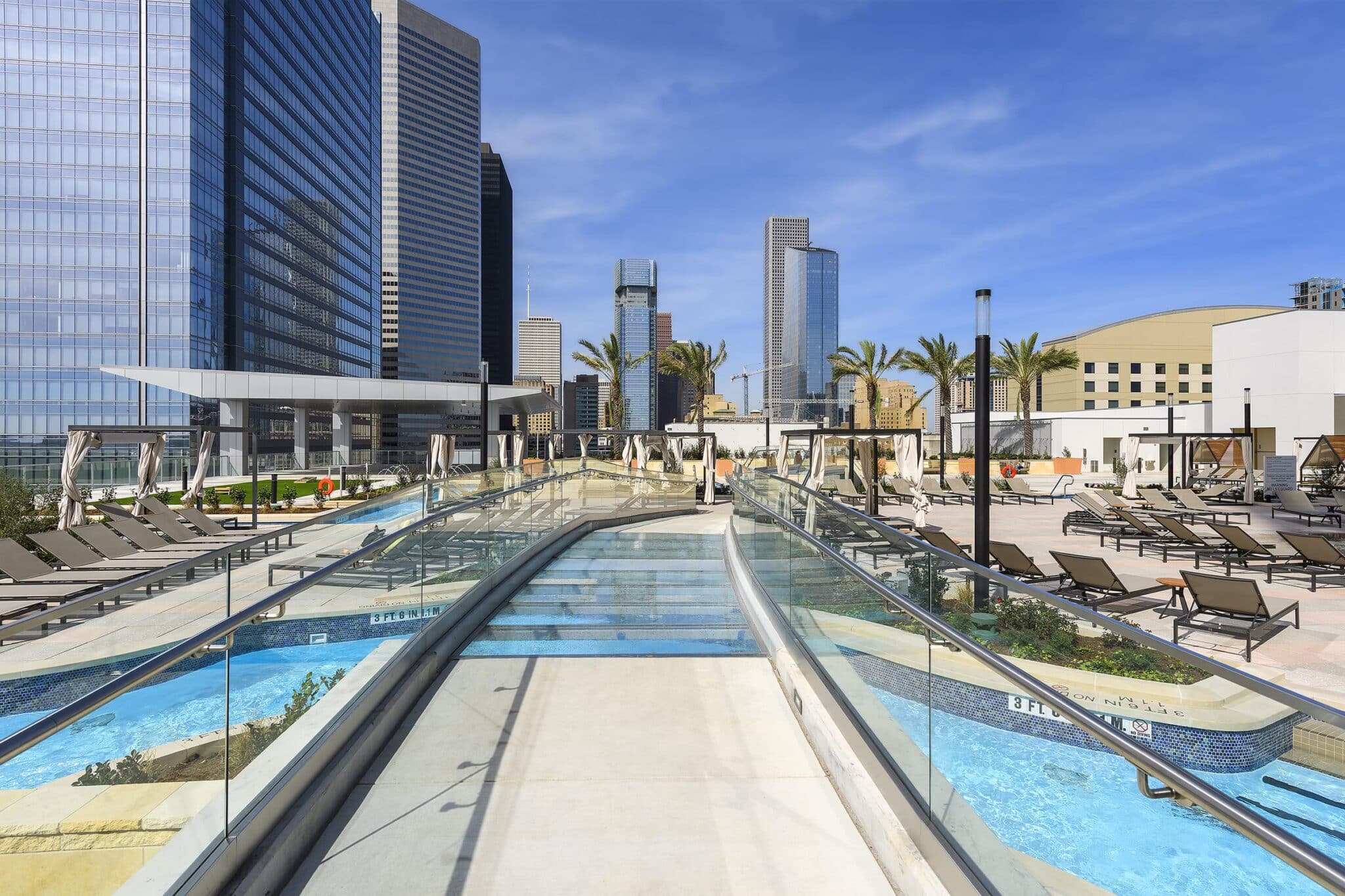 | HIGHLIGHTS: | Downtown Destination. Iconic Texas-Shaped Pool with Lazy River. Glass Pedestrian Bridges. Streetscape with Trees, Plantings, Lighting and Custom Paving. Detailed Design. Amenity Deck with Event Lawn, Interactive Splashpad, Fire Pits and Outdoor Lounge. |