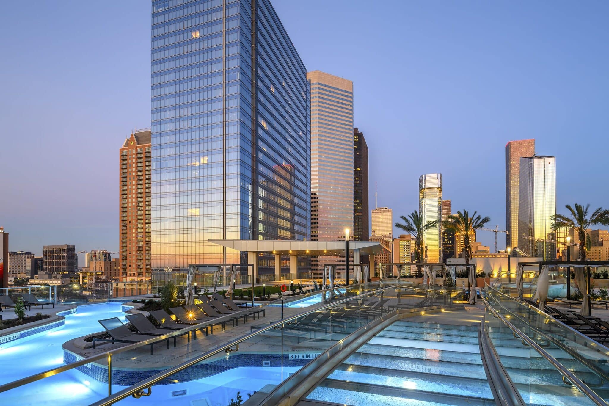 HIGHLIGHTS: | Downtown Destination. Iconic Texas-Shaped Pool with Lazy River. Glass Pedestrian Bridges. Streetscape with Trees, Plantings, Lighting and Custom Paving. Detailed Design. Amenity Deck with Event Lawn, Interactive Splashpad, Fire Pits and Outdoor Lounge. |