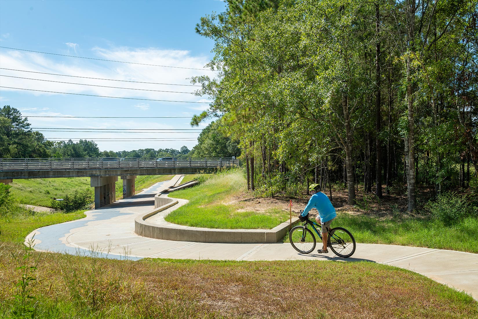 To facilitate safe access and increase connectivity, multiple strategies were utilized. The design team worked with Harris County to approve multiple mid-block crossings throughout the trail system including ADA compliant ramps, signage, and striping. A 135’ undercrossing was excavated along Faulkey Gully for pedestrians to safely traverse Spring Cypress Road, which is a heavily traveled major thoroughfare. Three 8’ wide pedestrian bridges over various facilities along the trail route provide greater connectivity across creeks and drainage channels.