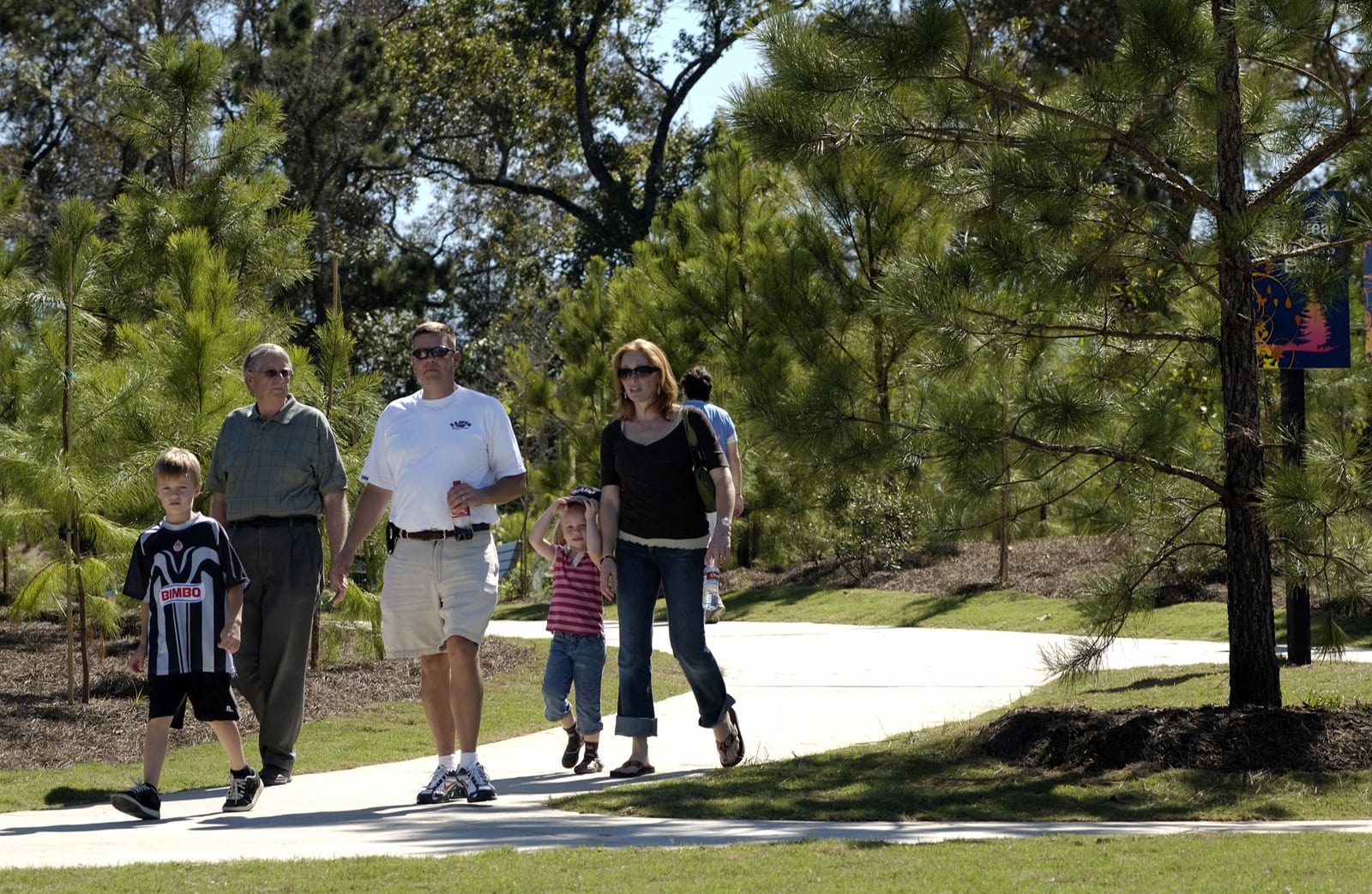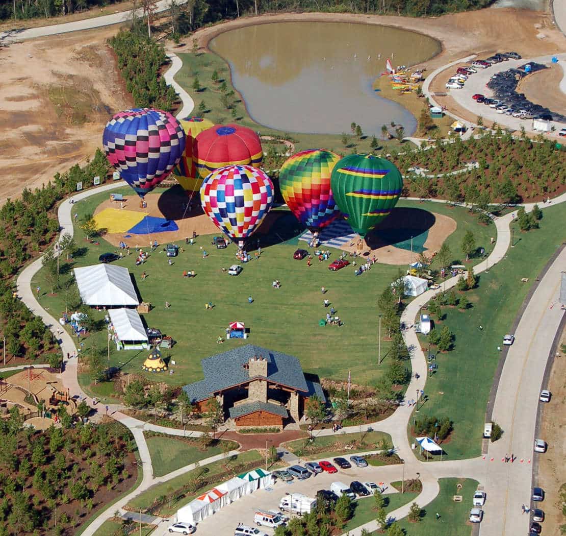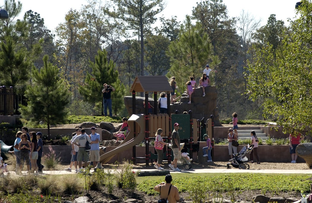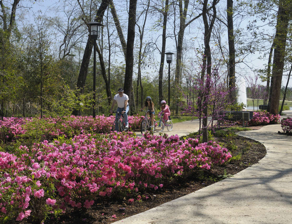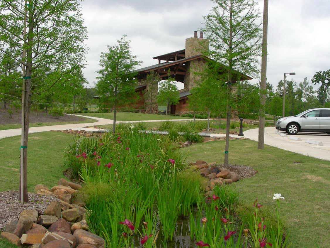 Many of the design features bring sustainable elements to the site, including native plants and bioswales. The park is heavily used for community events throughout the year and is a centerpiece for The Woodlands community.