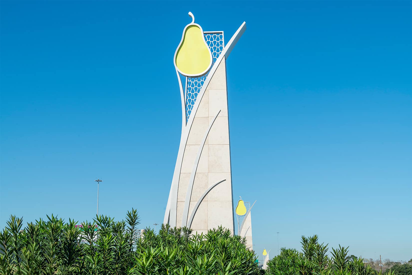 A popular transportation corridor linking downtown Houston to the Gulf Coast, SH 288 caters to a vast array of commuters, commercial trucking and travelers. It also provides direct access to The Texas Medical Center, the largest medical complex in the world. SH 288 transects Pearland, a vibrant and growing community southeast of Houston. In 2014, the Pearland Economic Development Corporation initiated a beautification master planning effort to develop a comprehensive city-wide branding and signage program, eliminate visual clutter, improve drainage, and enhance pedestrian and vehicular safety. Along SH 288, a series of 42’ tall monuments were designed to distinctively identify Pearland. A total of 16 monuments were installed at key intersections featuring custom designed, mixed materials of stone and metal, as well as a 9’8” lighted pear. Large fountains were designed and installed along the corridor, providing a dramatic arrival sequence at two of the city’s busiest intersections. Bounded by lush landscaping, shrubs, and trees, these key areas serve as a welcoming attribute for the once-barren spaces.