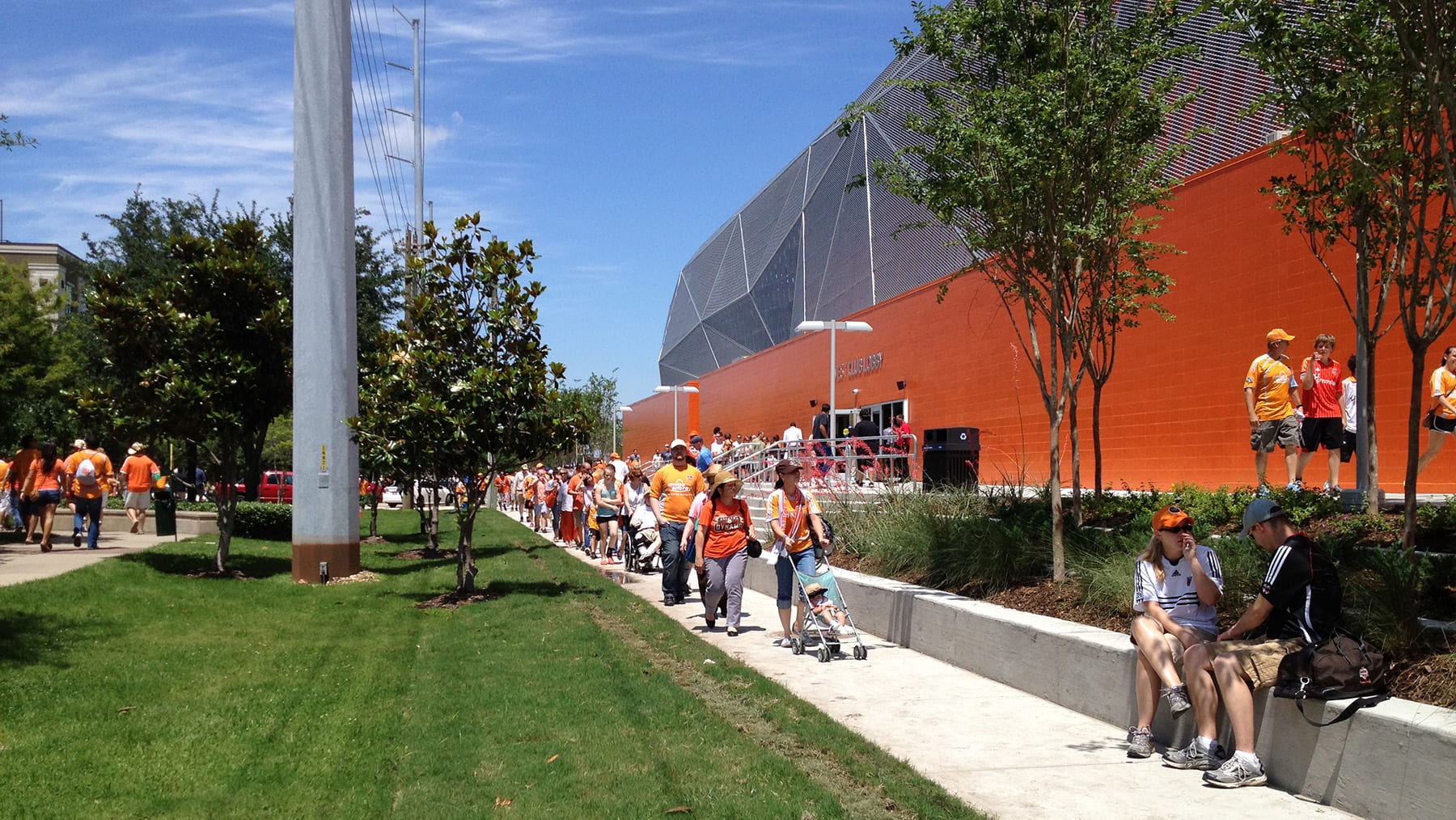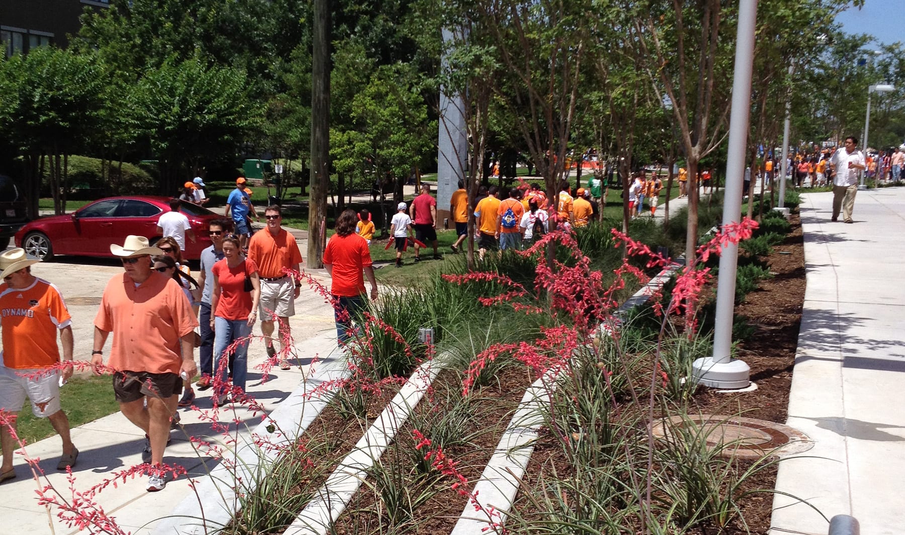 Formerly known as BBVA Stadium/PNC Stadium, this multipurpose sports and entertainment facility encompasses a six-city block area in downtown Houston within the TIRZ 15. It was a partnership between the City of Houston, Harris County, the Houston Dynamo, and the Houston Sports Authority. Our design provides a pedestrian-friendly zone from the stadium to the edge of the property. We designed everything outside of the open-air stadium from the hardscape to all softscape elements and the public spaces —- creating a large urban plaza. Our design cues came heavily influenced by the architect’s “mesh” stark angles in the stadium’s façade. We provided artificial grass panels on slopes for low maintenance and heavy pedestrian use. The grading intertwined the concrete with the plants and trees to give an interactive experience with the streetscape. This project is spurring a lot of revitalization in the formally dilapidated East End District.