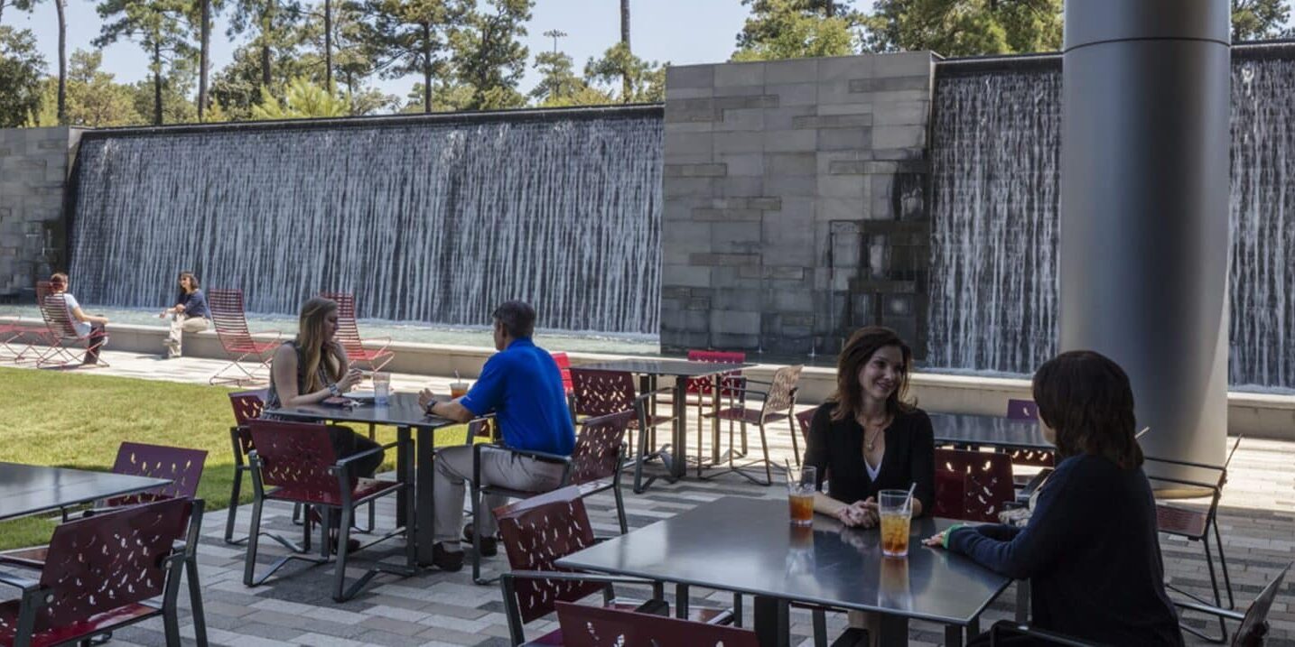 What sets this campus apart is the total integration of interior and exterior spaces. The building’s glimmering glass façade serves as a visual portal to the outside. The wooded landscape, native grasses, and wildflowers entice employees out into the environment to reflect, stroll, and exercise. A rooftop deck helps link the building’s two main towers while offering an alternative gathering space. Two courtyards anchor the exterior space. The first is an expansion of the conference area. The other is an outdoor dining space with a water wall for cooling and ambiance. Other key features are raised garden beds that the chef tends and uses every day to include fresh ingredients in his creations. Connectivity is also a key design feature because the site’s pedestrian and bike trails lead to the Springwoods trail system and open spaces. The Springwoods development, now called CityPlace, has a commitment to nature through unified energy and a seamless connection between people and nature.