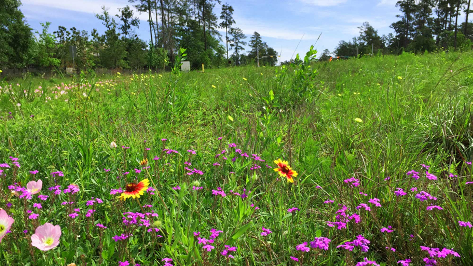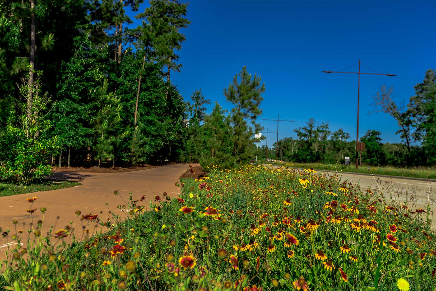 Springwoods Village is a 2,000-acre development coming to life in Spring, Texas in a unique ecosystem where the piney woods of East Texas meet the prairies of the Gulf Coast Plains. New roadways wind through forests and open spaces now enhanced with a linear meadow landscape covering 25 acres. Clark Condon’s team worked with Coventry Development Houston to design meadow landscapes that incorporated LID design principles throughout. The landscapes were designed to accommodate water flow, flooding, and water quality features.