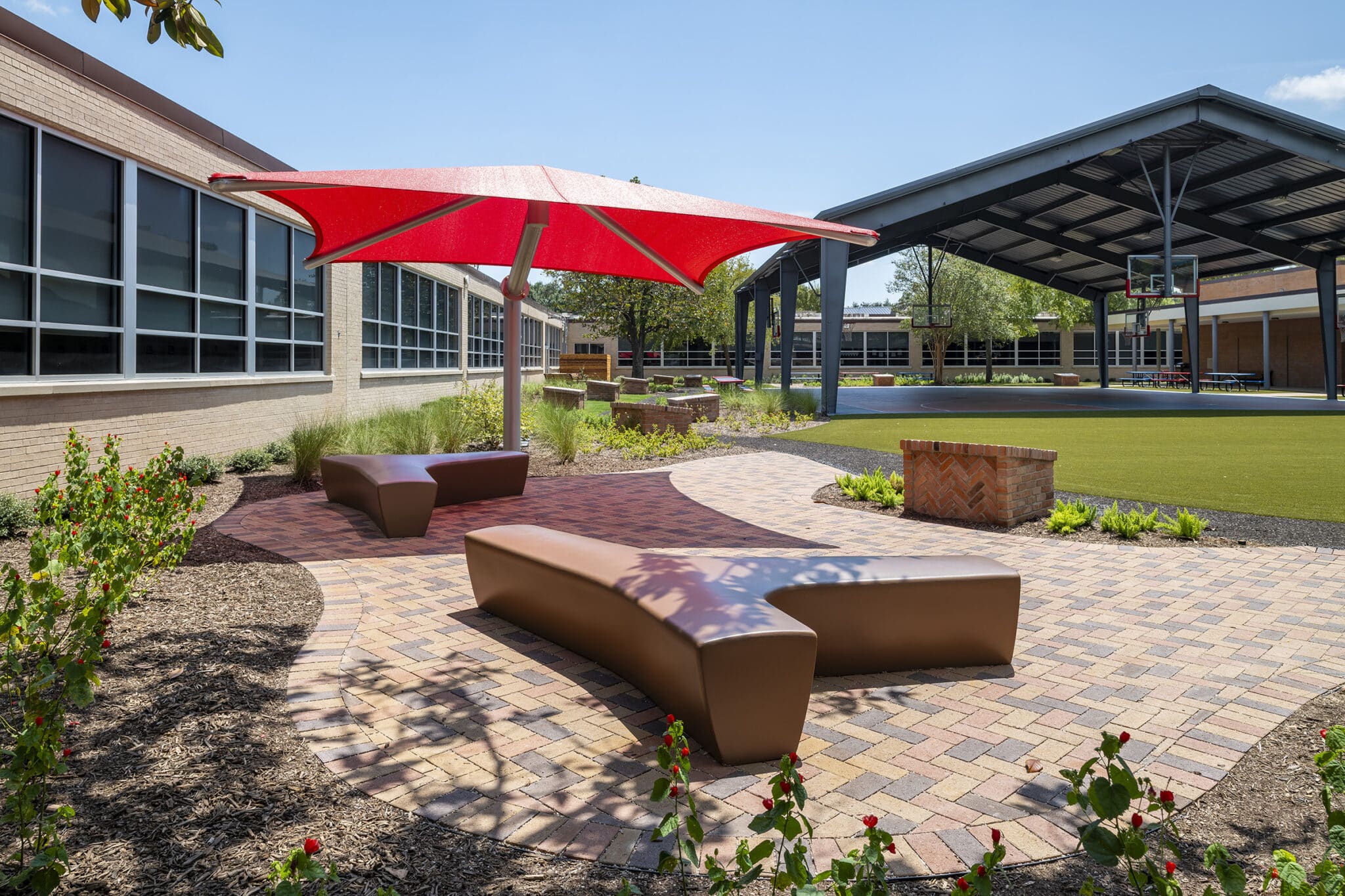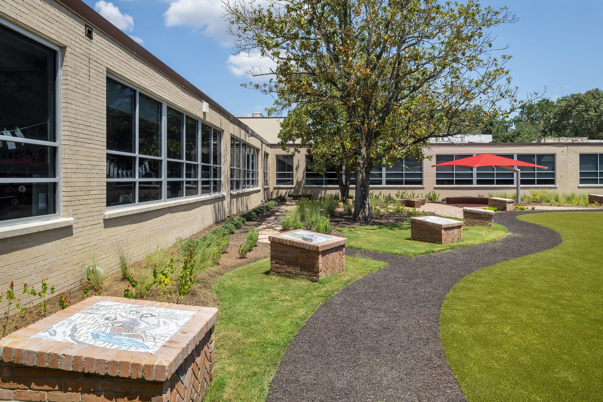 Robust retaining walls address site grading and improve both aesthetics and function. Modern hardscaping reimagines the campus walkways and gathering spaces. A playground provides opportunities for active play and social interaction across age groups, while new brick walls, fencing, and elegant entry gates better define campus boundaries.