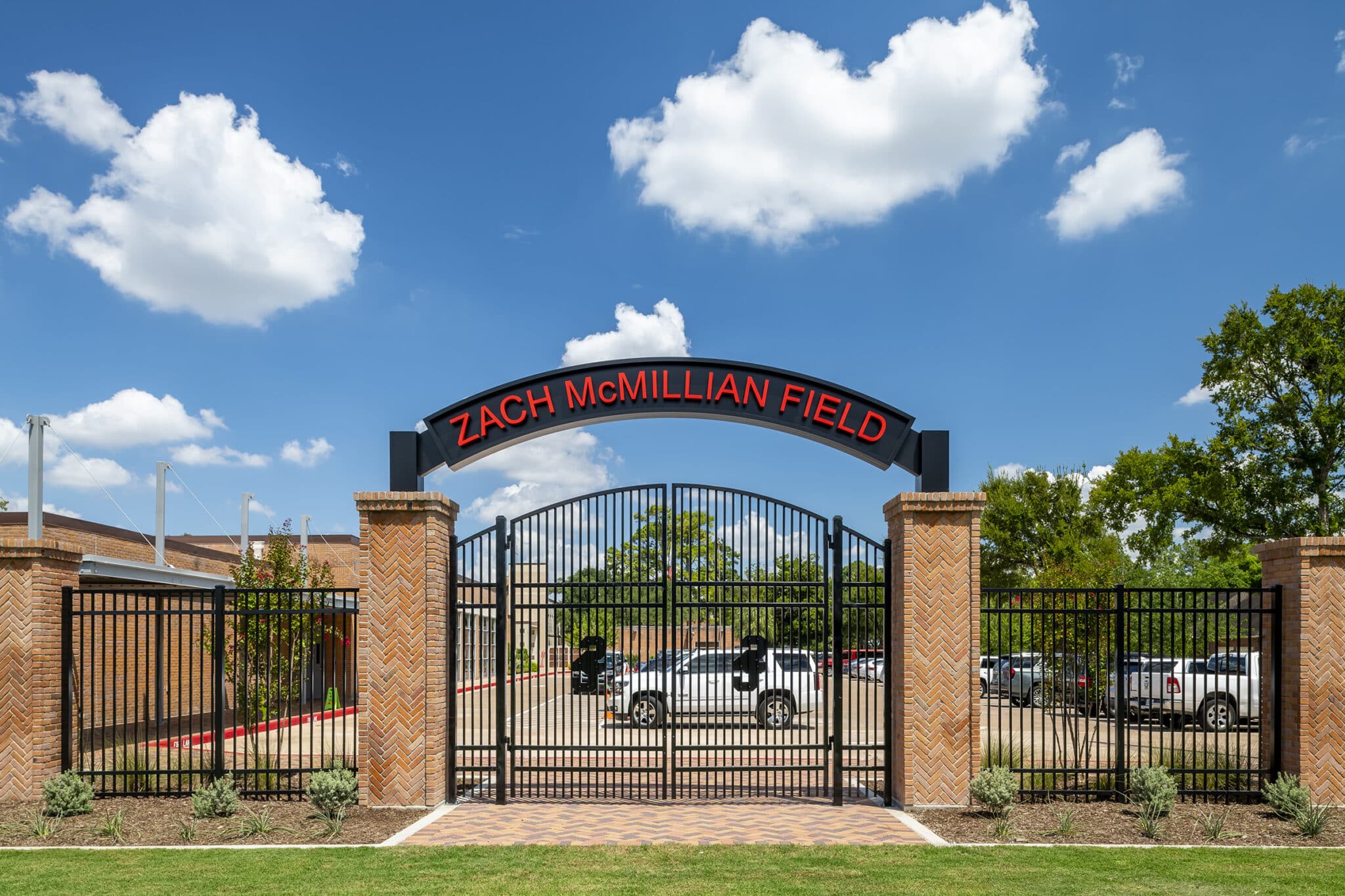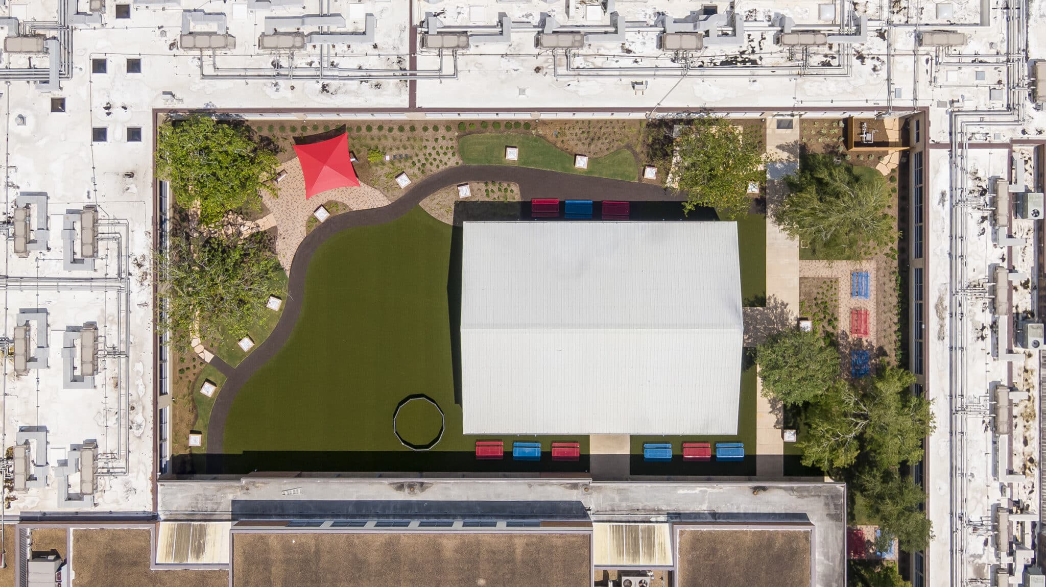 An open deck and a shaded, elevated viewing corridor offer panoramic views of the newly enhanced multi-use sports field with bleachers and sail shades for comfortable spectating.