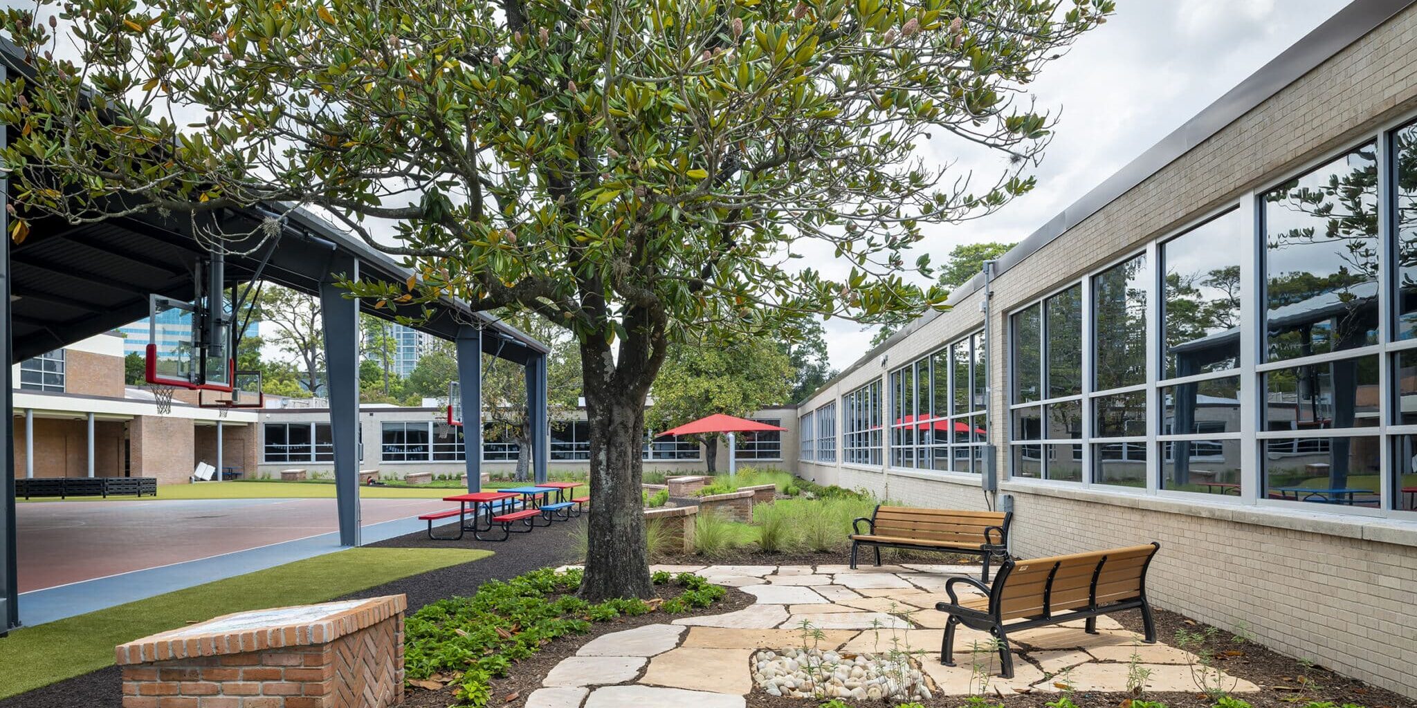 St. Cecilia’s Catholic School is a 2.5-acre private institution for pre-kindergarten through eighth grade students in Houston’s Hedwig Village. An open space master plan introduced conceptual design ideas and programming options that embraced the school’s guiding tenets. Now fully realized, these enhancements transform the campus with a landscape that thoughtfully integrates amenities that cater to both education and recreation.