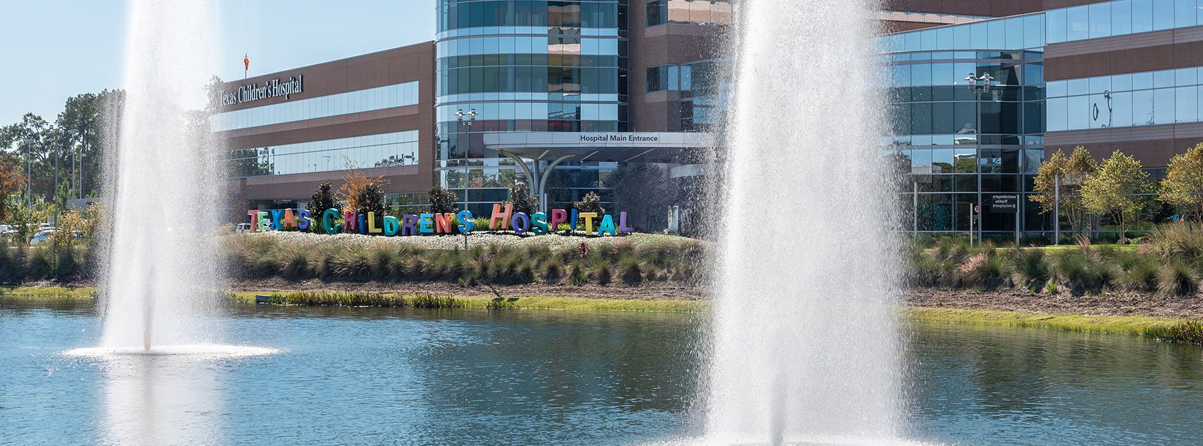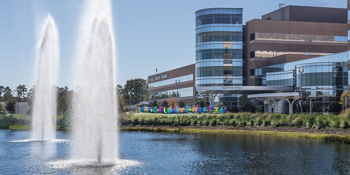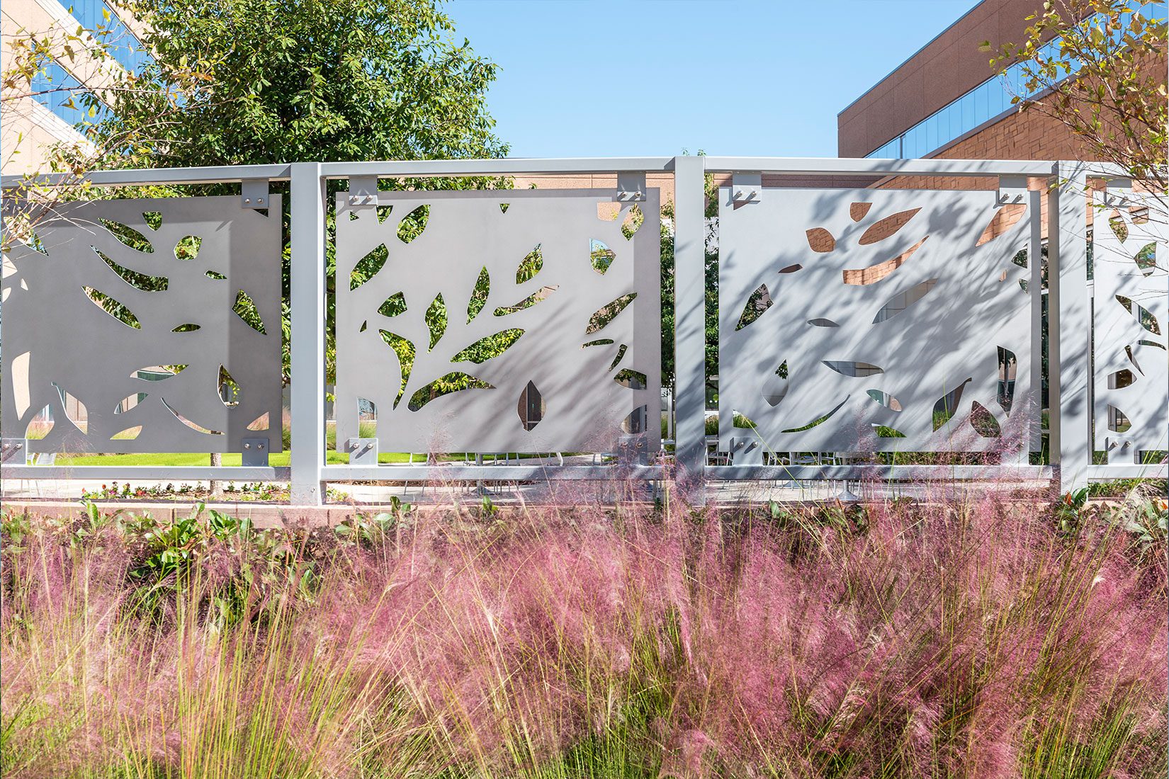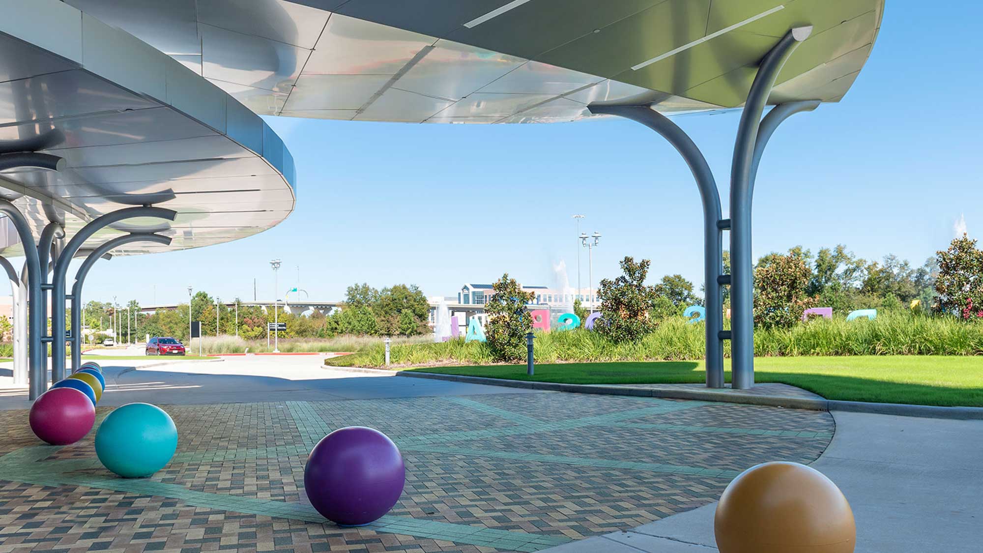 Clark Condon worked on the new Texas Children’s Hospital project in The Woodlands along with FKP Architects (now CannonDesign). The site includes a medical office building, parking garage and a large detention pond spread across 23 acres. Texas Children’s Hospital is accentuated by playful letters dancing across the landscape in front of the facility. The architect envisioned a nature theme that is seamlessly integrated from the interior to the exterior landscape. A large leaf canopy structure covers the central drop off space offering shade and a whimsical arrival. The paver pattern in the entry mirrors the leaf structure overhead, and playful, colored bollards make for a unique welcome experience. The leaf expression continues through the building to the courtyard space where patients, employees and visitors can find respite among the large shade trees. In the courtyard, a perforated metal screen integrated into a seatwall provides a buffer from the nearby drive. Phase I was completed in 2017.