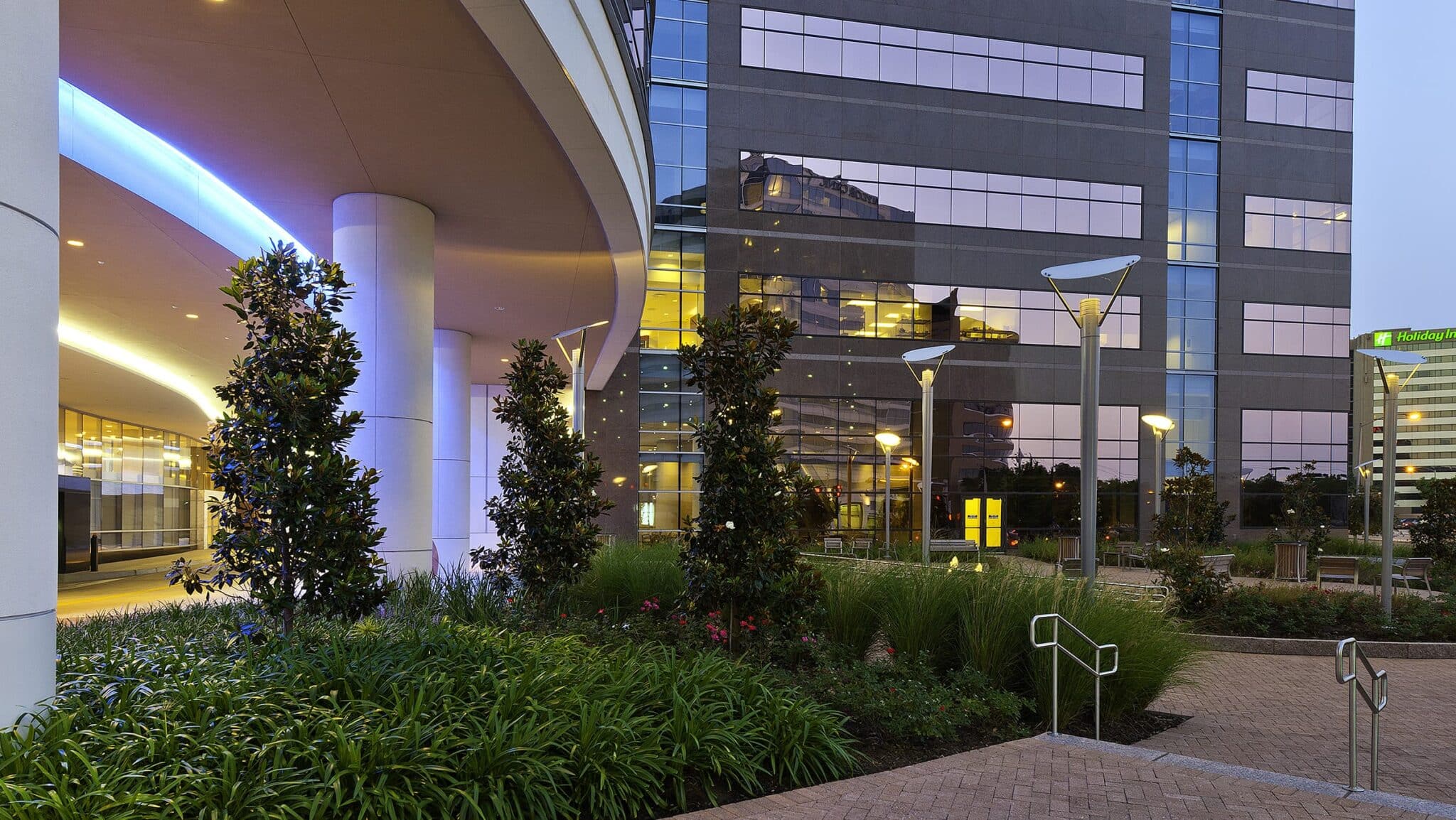 Clark Condon worked with the design team to create a memorable landscape for the Texas Children’s Hospital Pavilion for Women in the Texas Medical Center. The new 15-story hospital includes a maternity center, clinic, and office spaces as well as additional pediatric components. Connecting to the existing TCH campus via a two-level signature sky bridge, the ultimate site will provide 1.7 million square feet to serve both obstetric and pediatric patients on this urban site. The landscape design created lush edges along the street and garden pockets with water, lighting, and seating for visitors, patients, and employees to enjoy. We also worked with this client to develop a signature landscape and entrance icon at their West Houston campus.