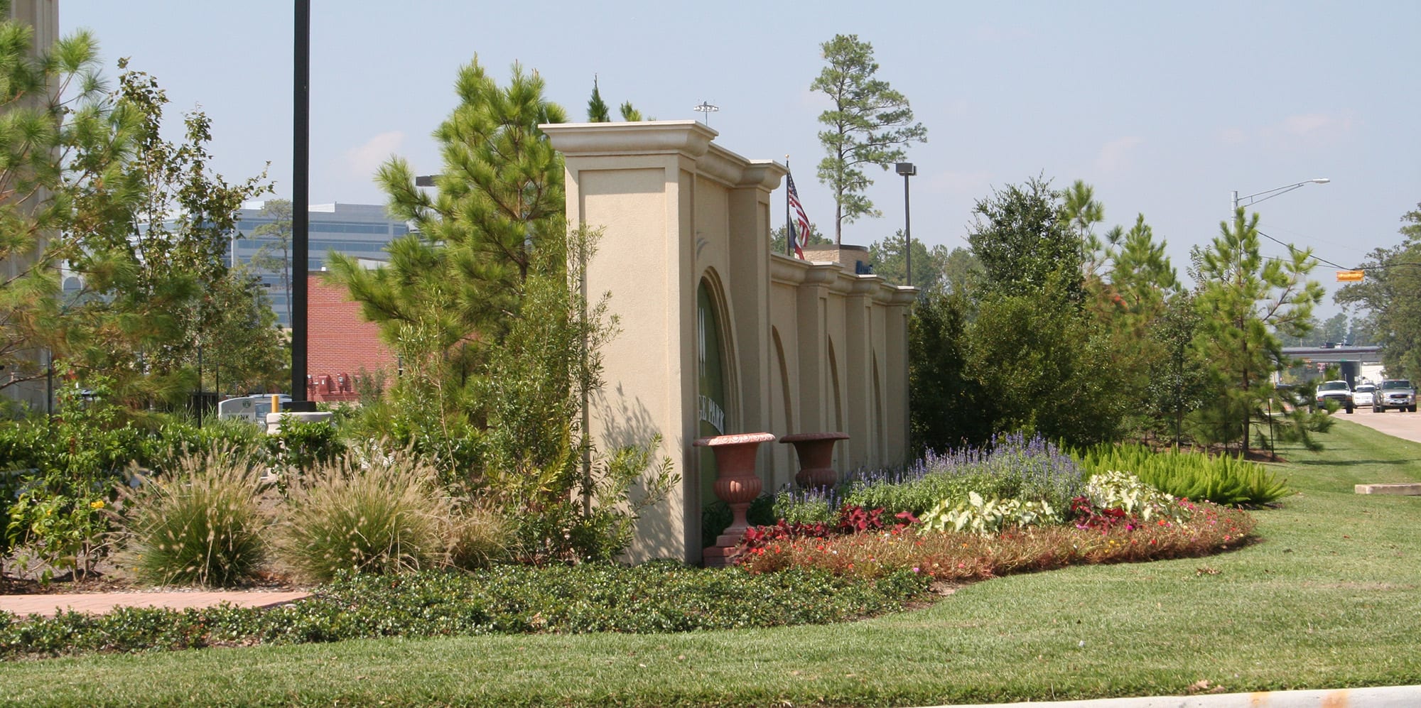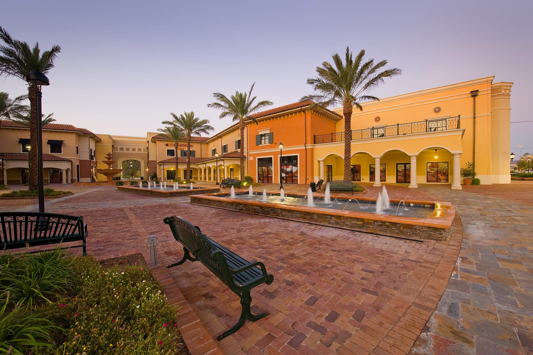 Vintage Lifestyle Park is an upscale, mixed-use development located in Cypress, Texas just northwest of Houston. The project is anchored by a 500,000-square-foot retail development covering 31 acres of the 84-acre mixed-use development. The development is connected with boulevarded streets, pathways, and sidewalks and identified with signature and unified entrances. This upscale lifestyle shopping destination is designed in the Mediterranean style. Italian Cypress and large pots with colorful plantings mark the entryways to the project. Tree-lined streets provide shade and help create a sense of arrival. A central piazza consists of a series of fountains culminating in a 25’ diameter tiered Italian fountain and covered arched porticos.