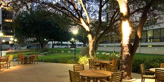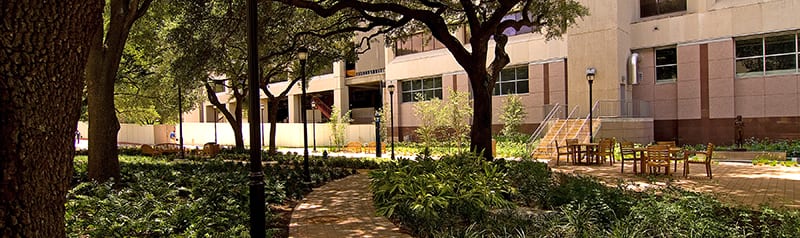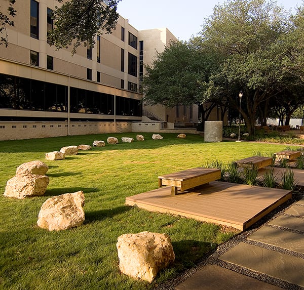 Set in the heart of The Texas Medical Center, we designed this space to provide a “people place” for the campus. A large semi-circular deck under existing live oaks provides a place where students and faculty can relax in a comfortable outdoor setting. An arc of limestone boulders placed on the fine-textured zoysia lawn becomes a playful feature while a fountain with a vanishing edge creates another focal point. The variety of materials, size of space, shade of the live oaks and water make this a favorite oasis among the density of the Medical Center.