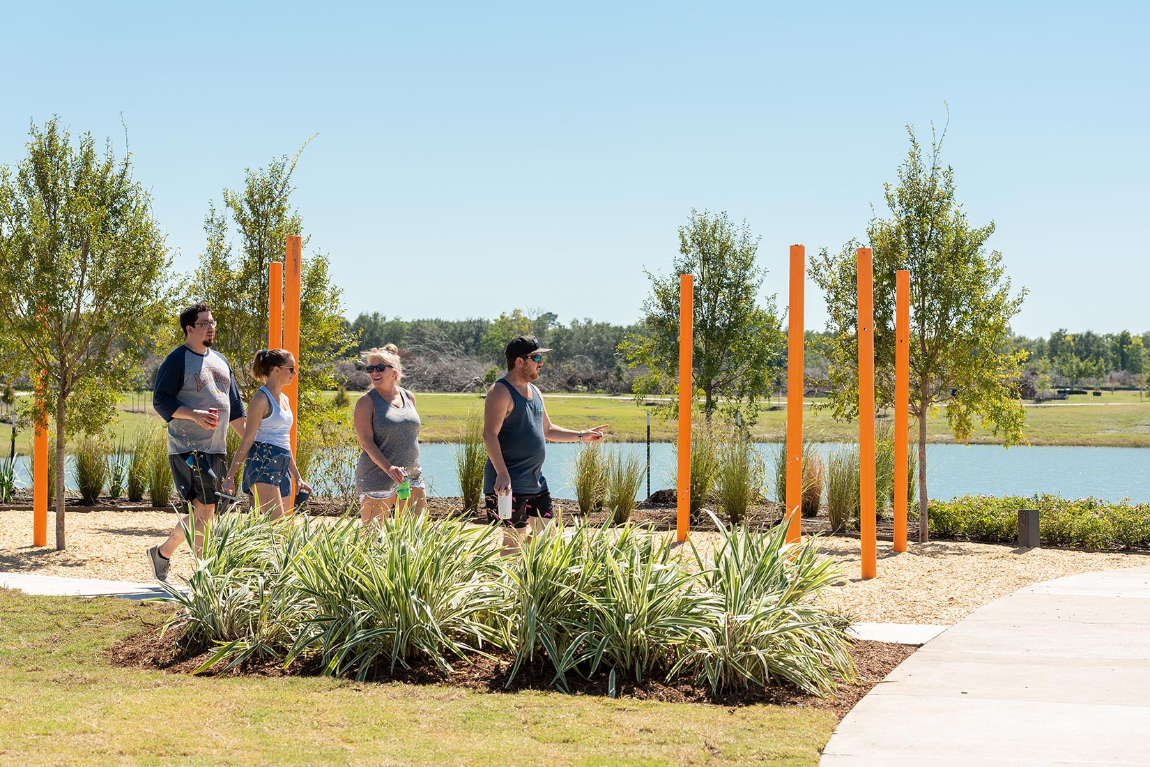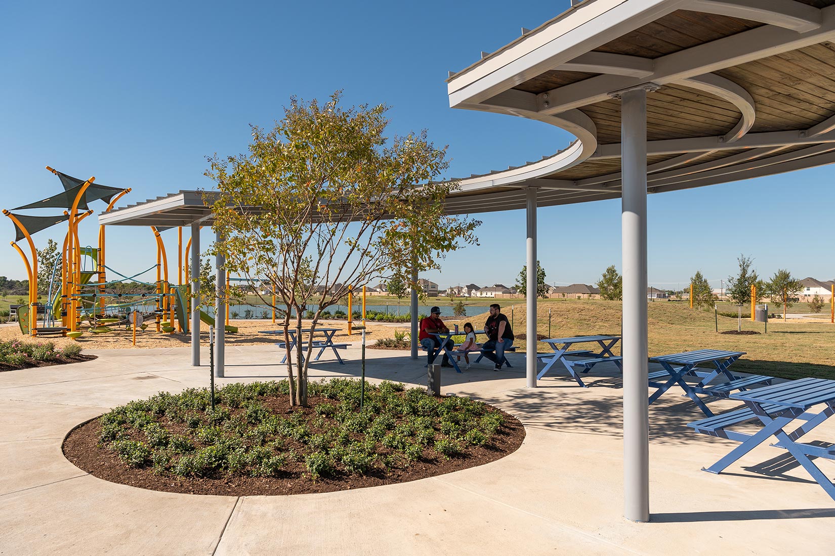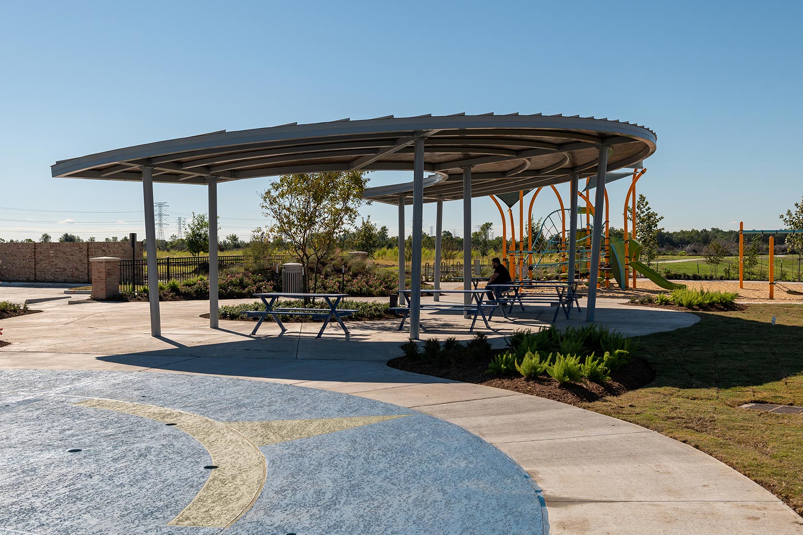 Clark Condon assisted in the design of Windrose Green, a 154-acre single family residential development in Angleton, Texas. To establish the overall character of the community, materials and the planting palette were meticulously selected. The community entry design included thoughtful crafting of the signage, logos, and landscaping. Multiple types of lighting were integrated, and natural light is filtered through the decorative entrance brick masonry, showcasing an intricate pattern. Over one mile of trails connect Windrose Green to amenity ponds and central park space. Residents can easily access the 1.5-acre park which features a custom splash pad and pavilion, playground, event lawn, gathering space with hammocks, and beautiful plantings that include a mix of native and adaptive species. The development’s detention ponds were enhanced with walking trails, native trees, seating areas, a lighted aeration fountain, and wildflower planting.