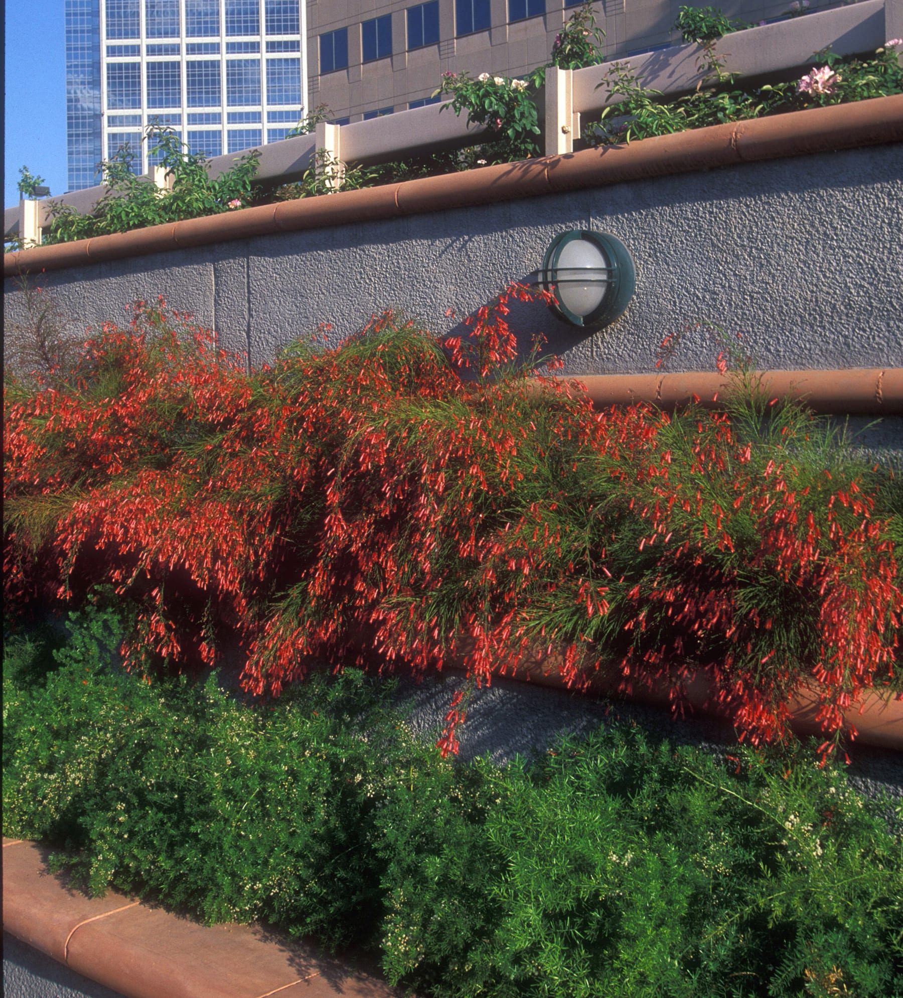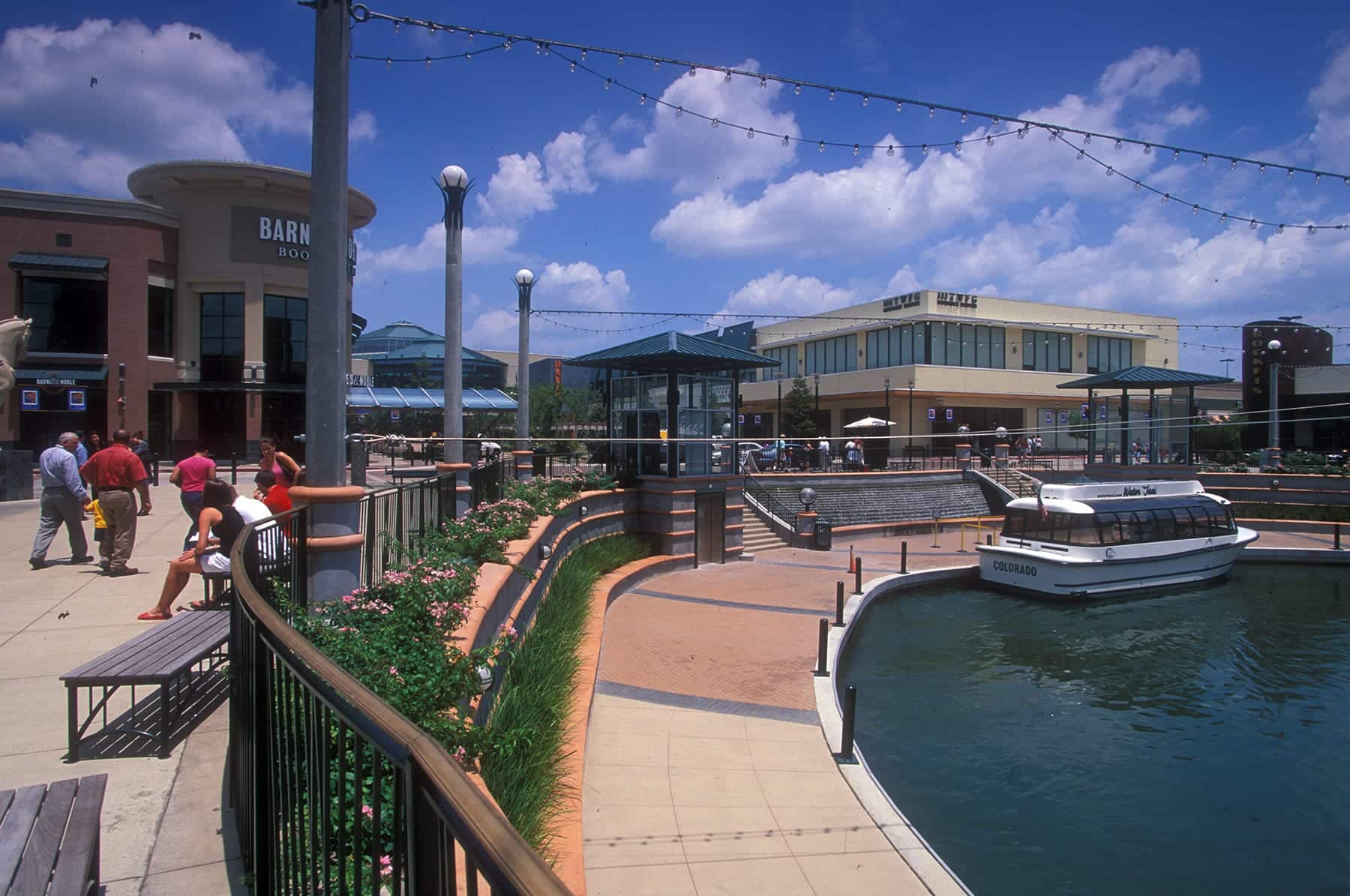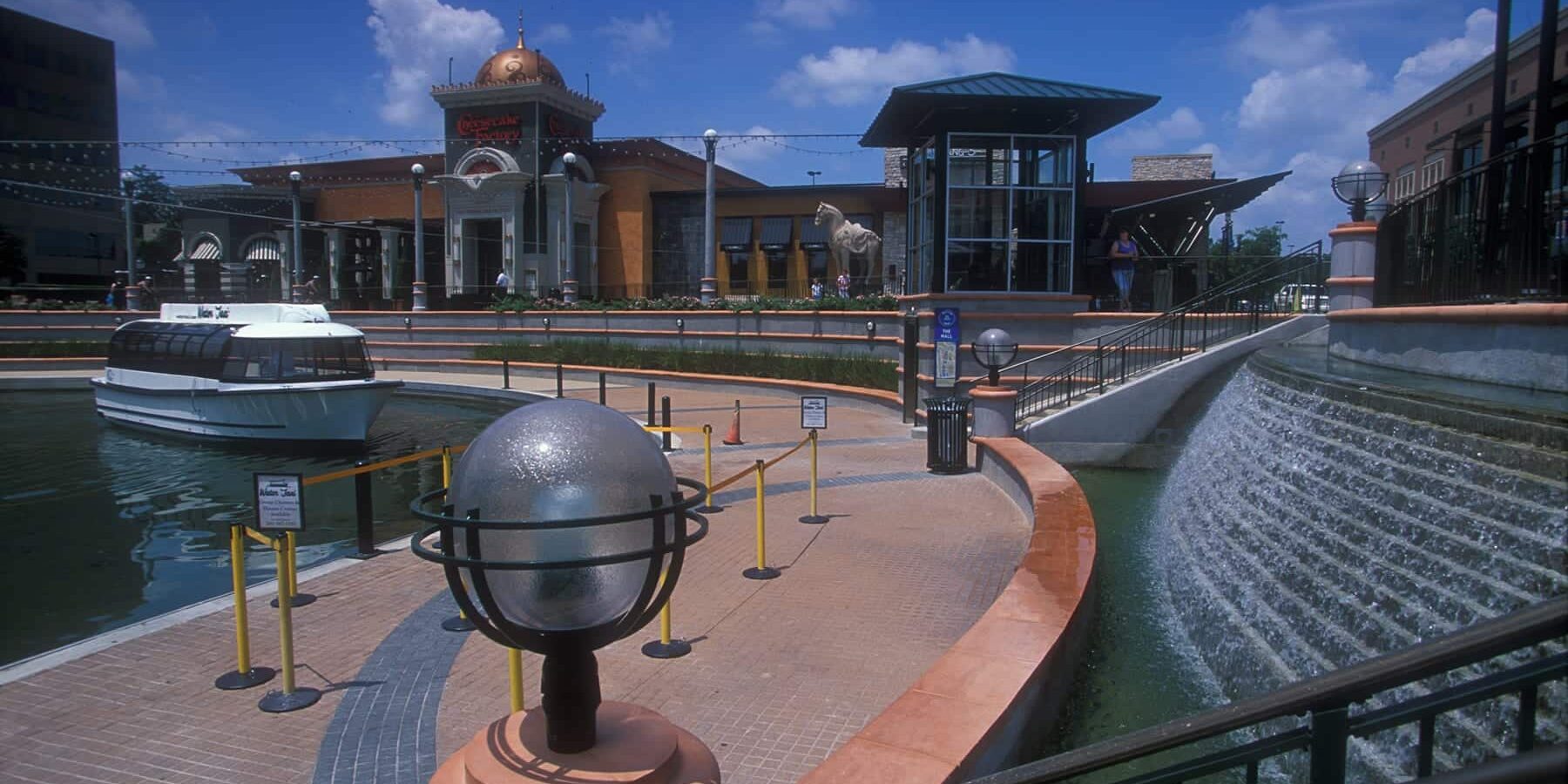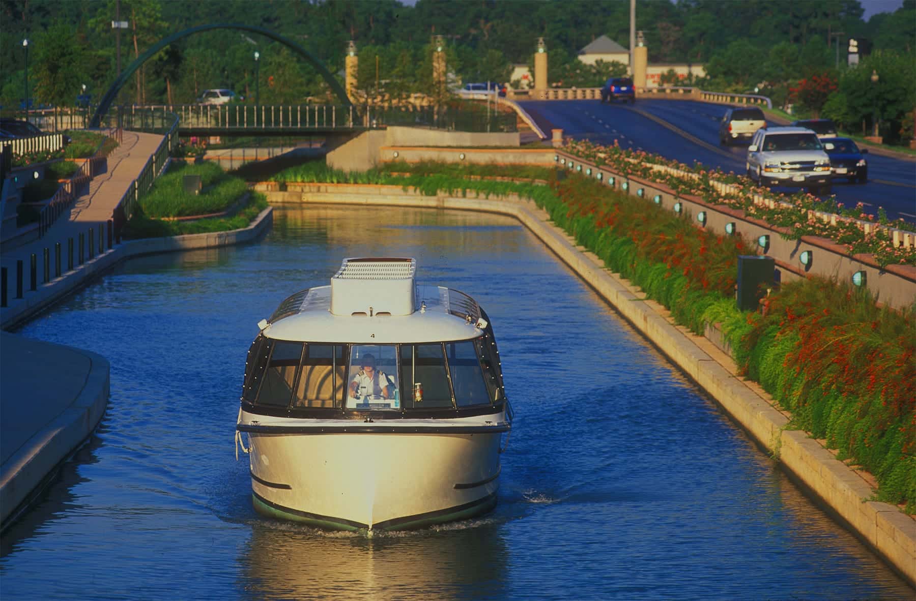 The Woodlands Waterway is a 1.2 mile long transportation corridor linking office buildings, shopping, dining, residential and entertainment venues in The Woodlands Town Center. The extension from Lake Robbins to The Woodlands Mall includes a turning basin and water taxi stop. There are distinctive pedestrian bridges over the water. In addition to facilitating water taxis the extension is also a pedestrian corridor with a variety of urban amenities. The waterway is eight feet lower than the surrounding mall and required several stairs, ramps and elevators to provide access between them. The design includes accent fountains and festive lighting.